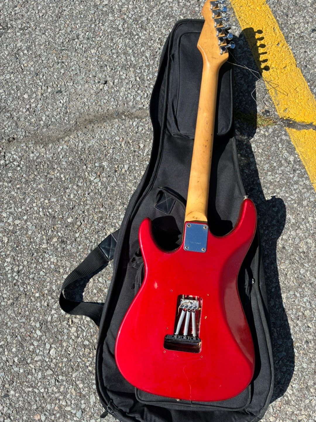 Selling a red Peavey electric guitar. It comes with a black Guitar Research case. Perfect for someone looking to start playing or upgrade their current instrument. Has wear and tear and requires some repair to the back of the guitar
