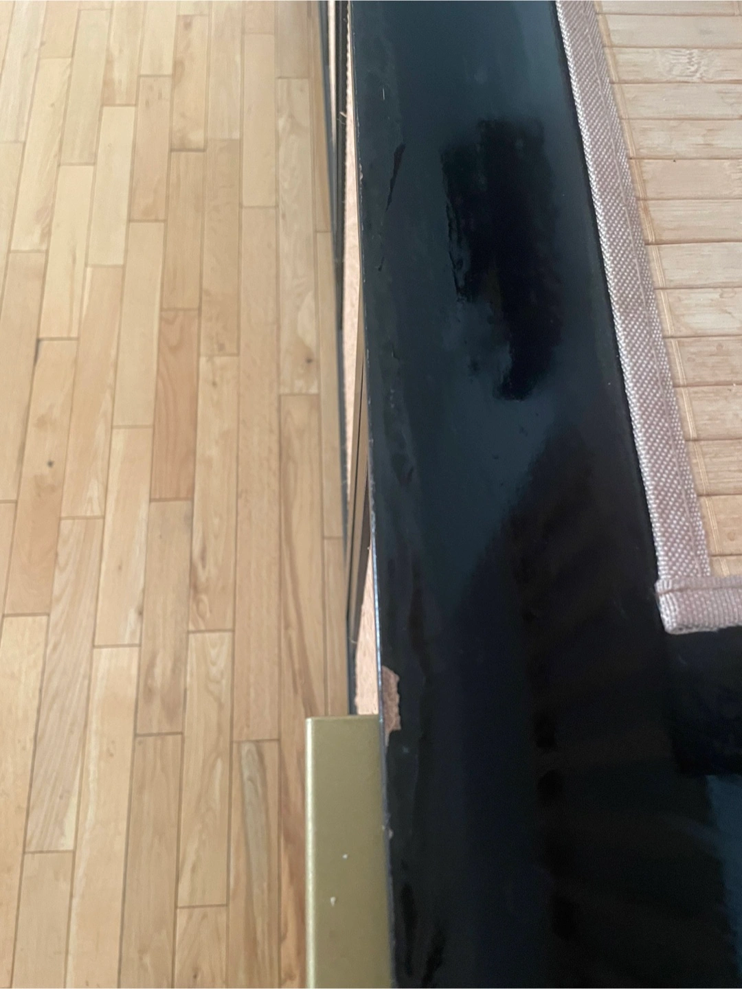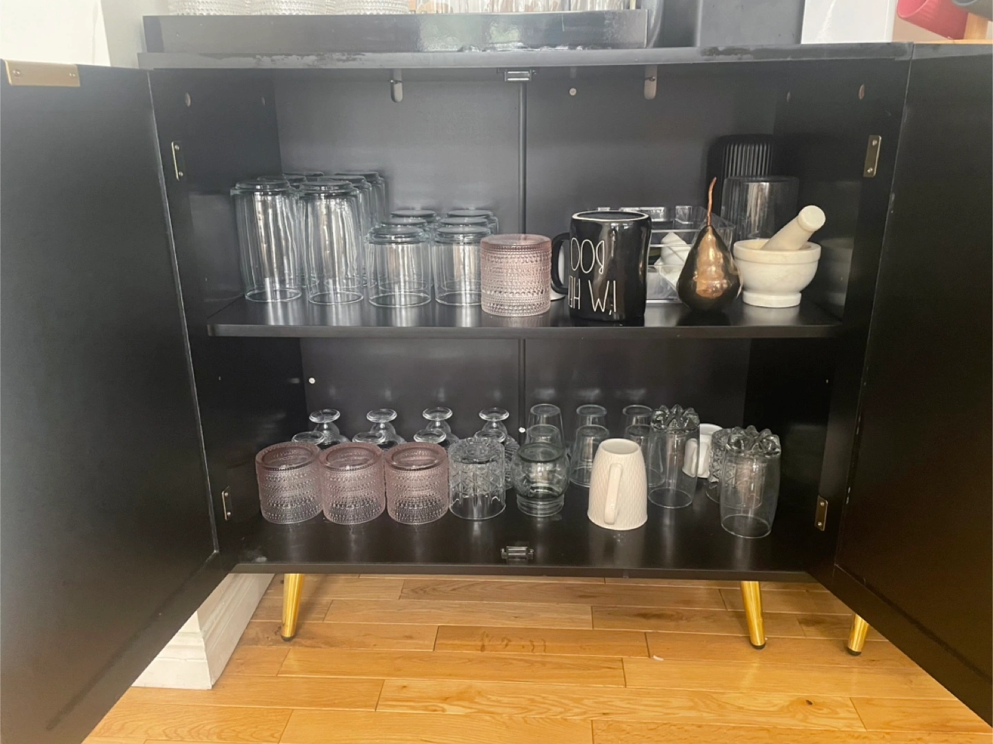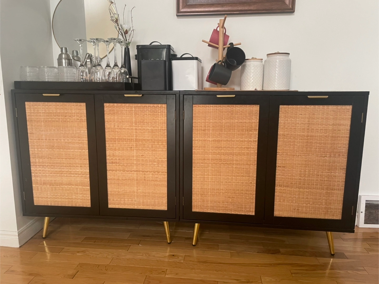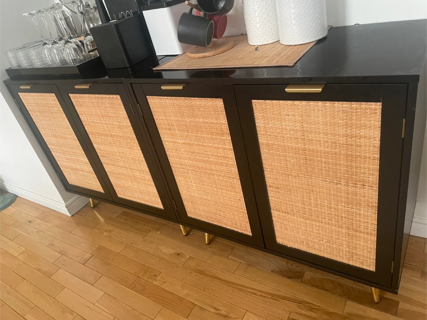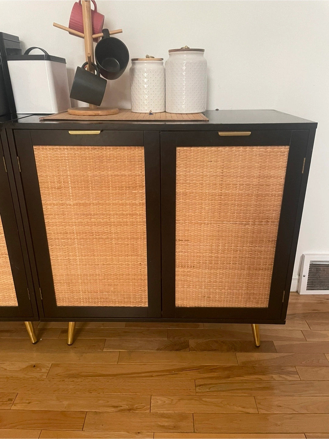 Selling a stylish cabinet with a black frame and rattan door panels. The cabinet has gold legs and offers ample storage inside. It's in great condition and ready for a new home! Selling as a set of 2. Dimensions- height- 30 1/2 inches, length( of one cabinet) 31 inches or 62 inches joined together and width 16 inches. It was a small scratch( refer to the last image).