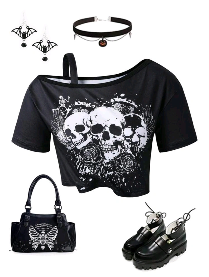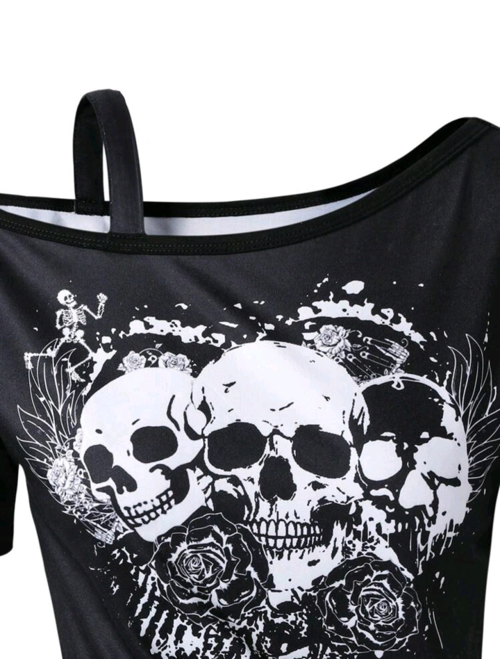 Black one shoulder top with a skull print design. Size 11y ( fits 10-12y) Perfect for Halloween.
