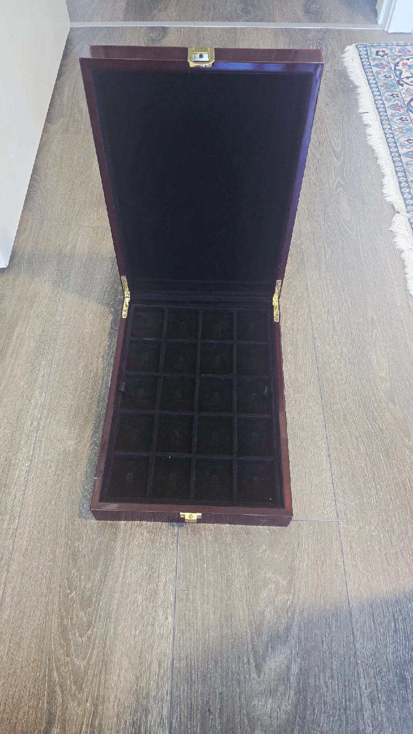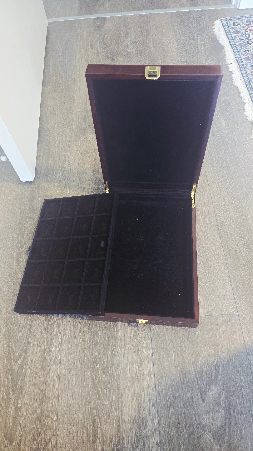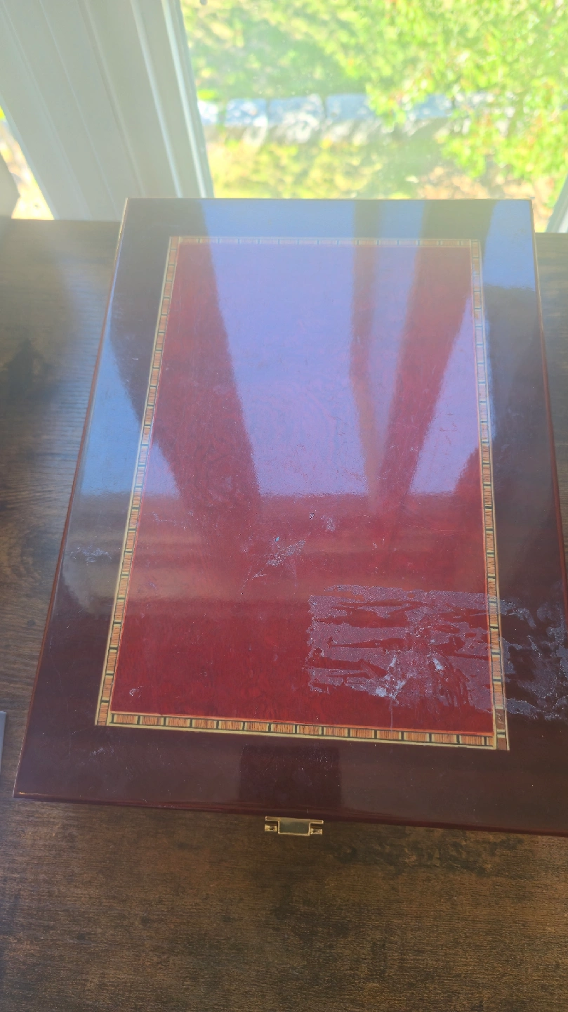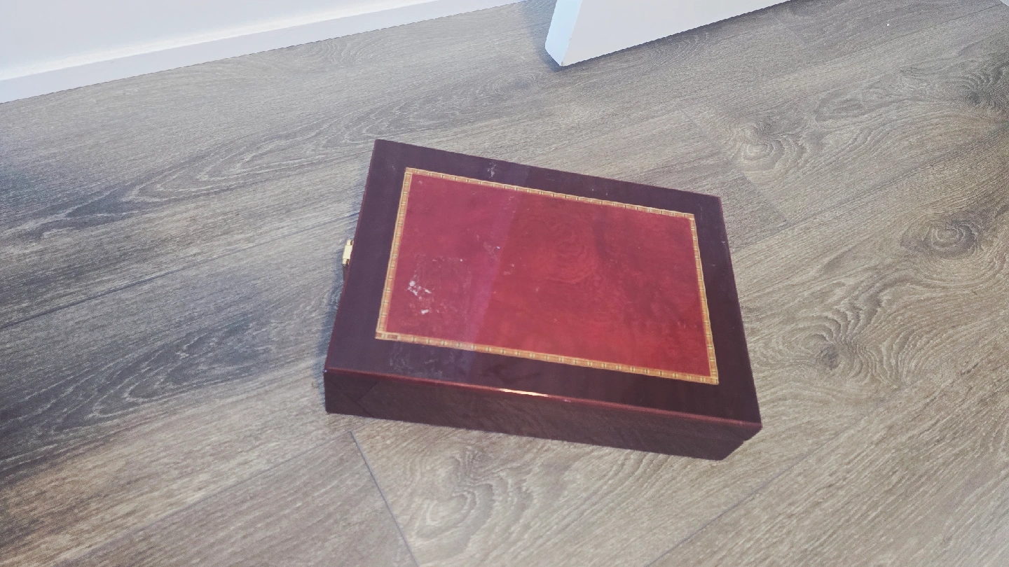 Selling a wooden jewelry box. It's in good condition and has a dark brown finish with a red accent on the lid. The inside is lined with black velvet, perfect for storing your precious jewelry! There’s a sticky mark on the lid that you can wipe off.