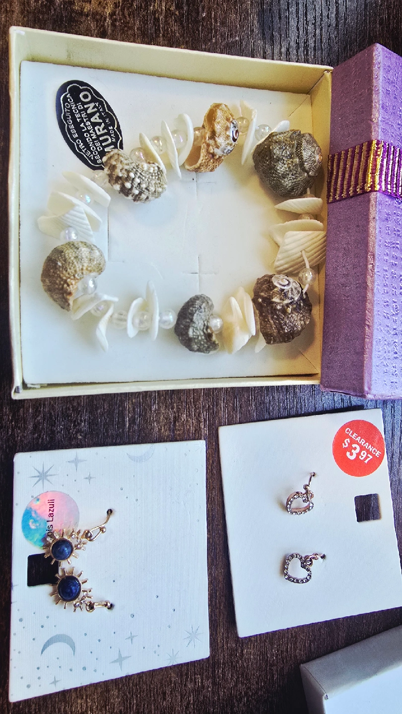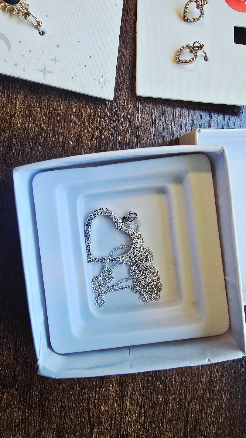 Selling a collection of necklaces and earrings. Includes a shell necklace in a box, a pair of earrings with blue stones, a pair of heart-shaped earrings, and a heart-shaped necklace with a chain. All brand new!