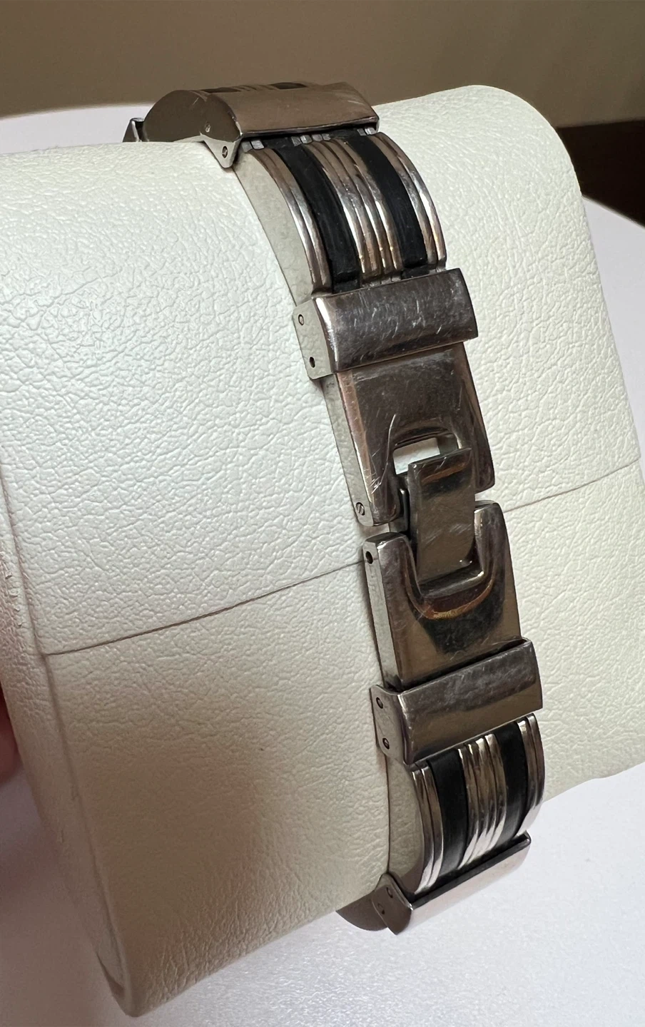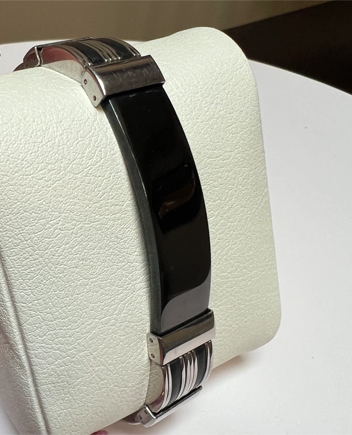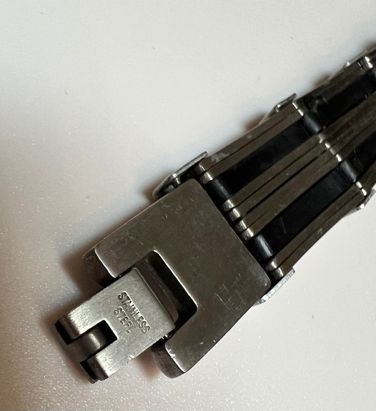 Stylish men’s stainless steel bracelet featuring black accents Fold over secure clasp Preloved Good condition with minimal wear 9” long The links can be removed to make the bracelet smaller Asking $10 Interested? Messsge me and please check my other listings…