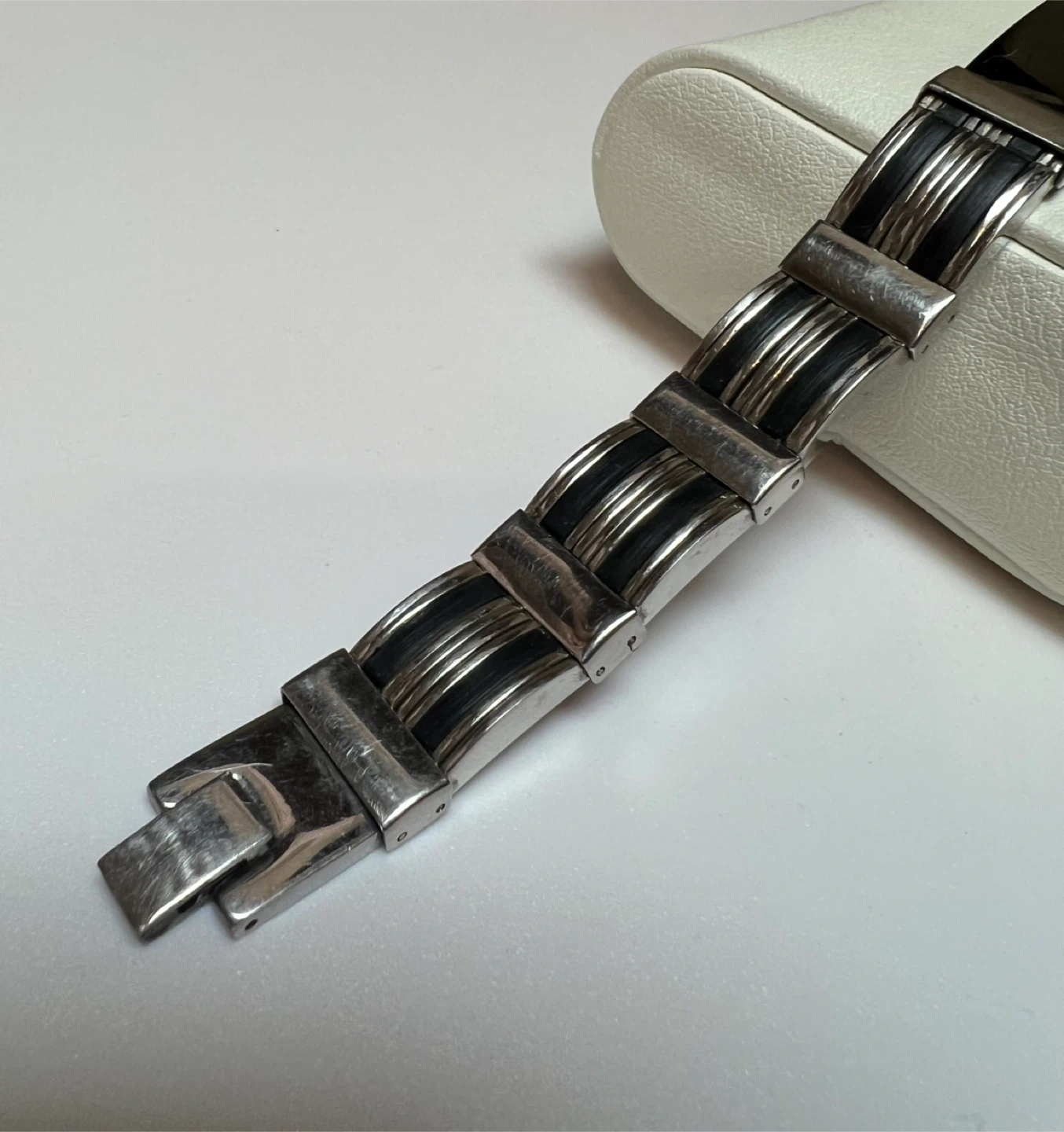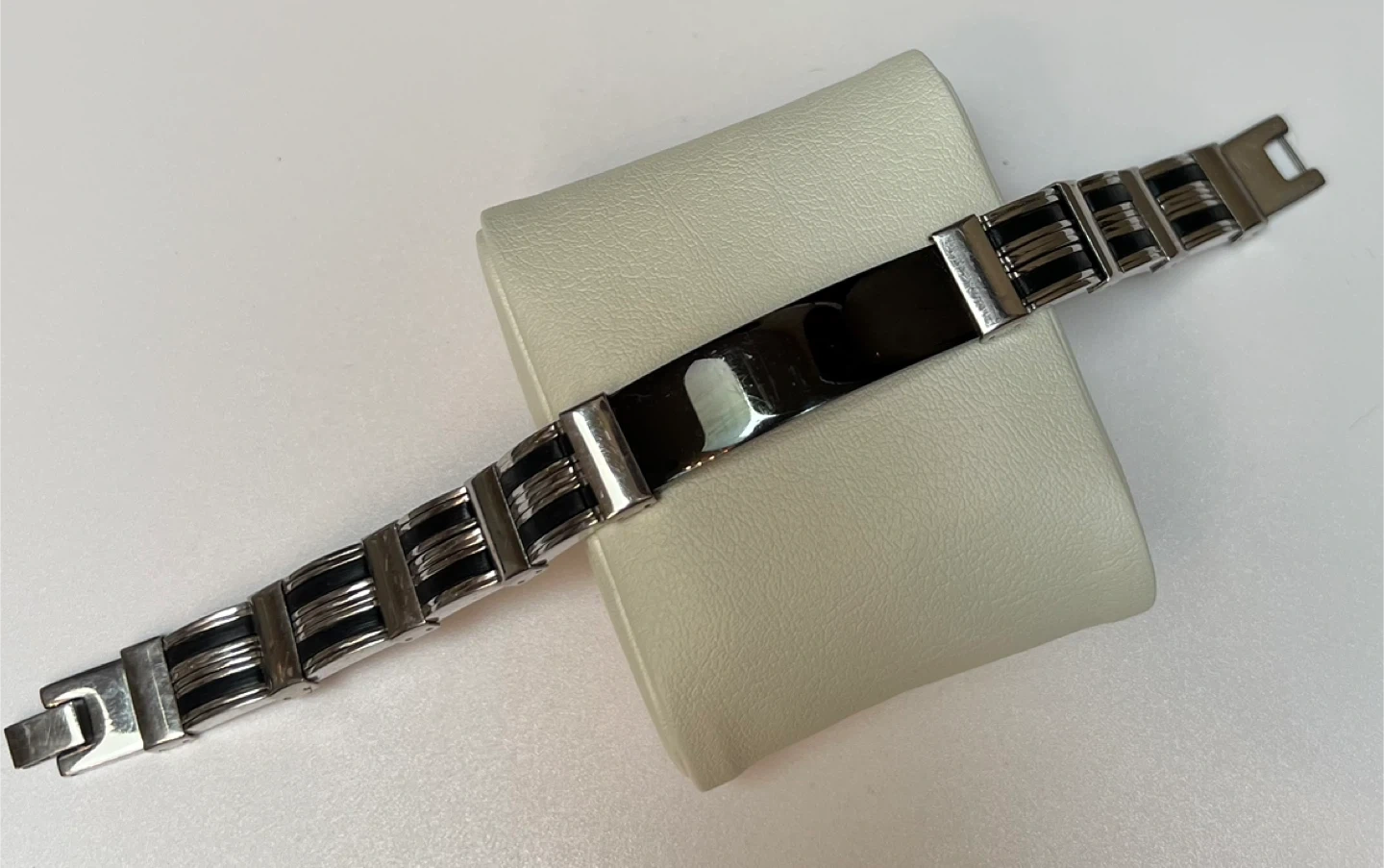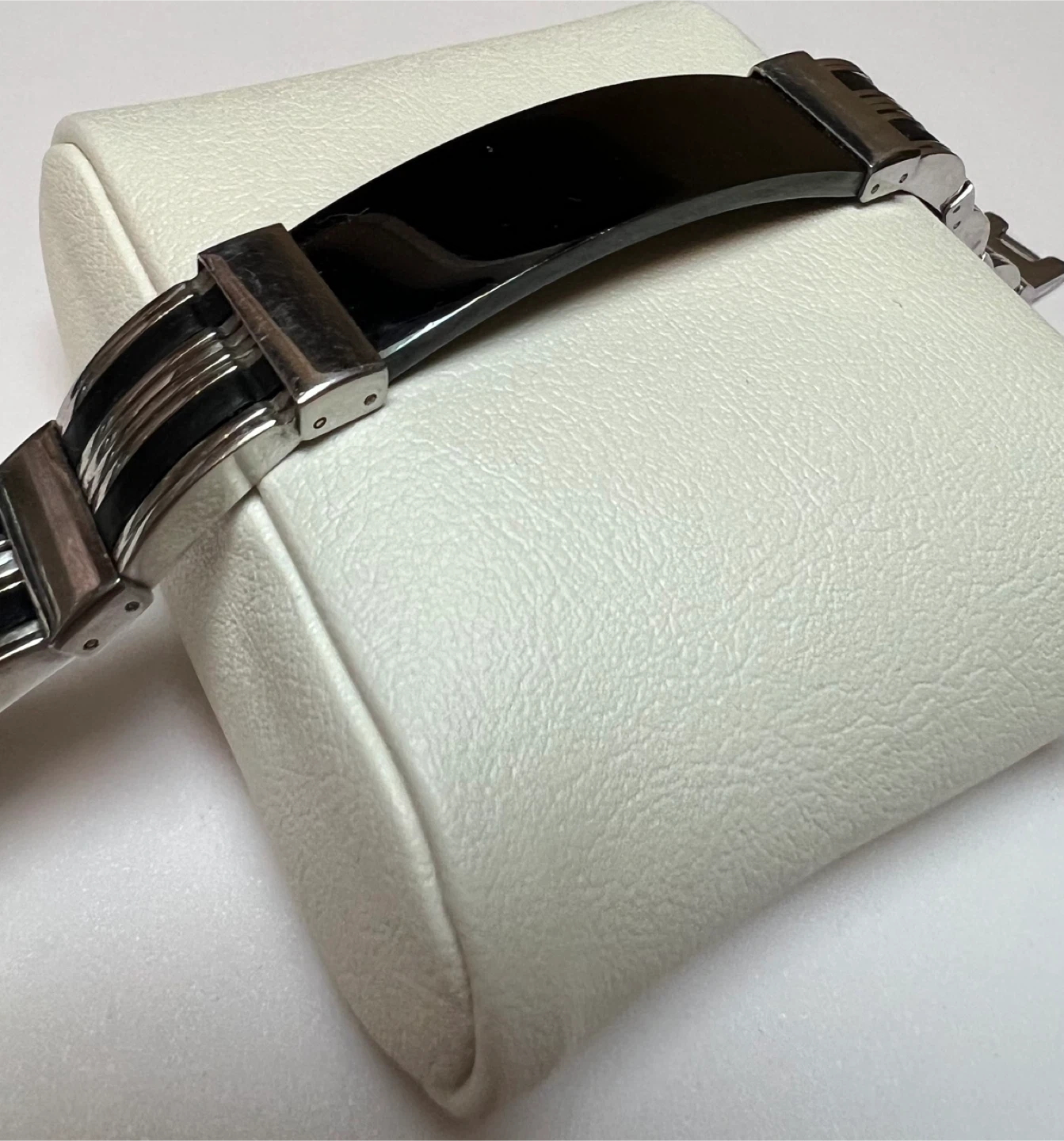 Stylish men’s stainless steel bracelet featuring black accents Fold over secure clasp Preloved Good condition with minimal wear 9” long The links can be removed to make the bracelet smaller Asking $10 Interested? Messsge me and please check my other listings…