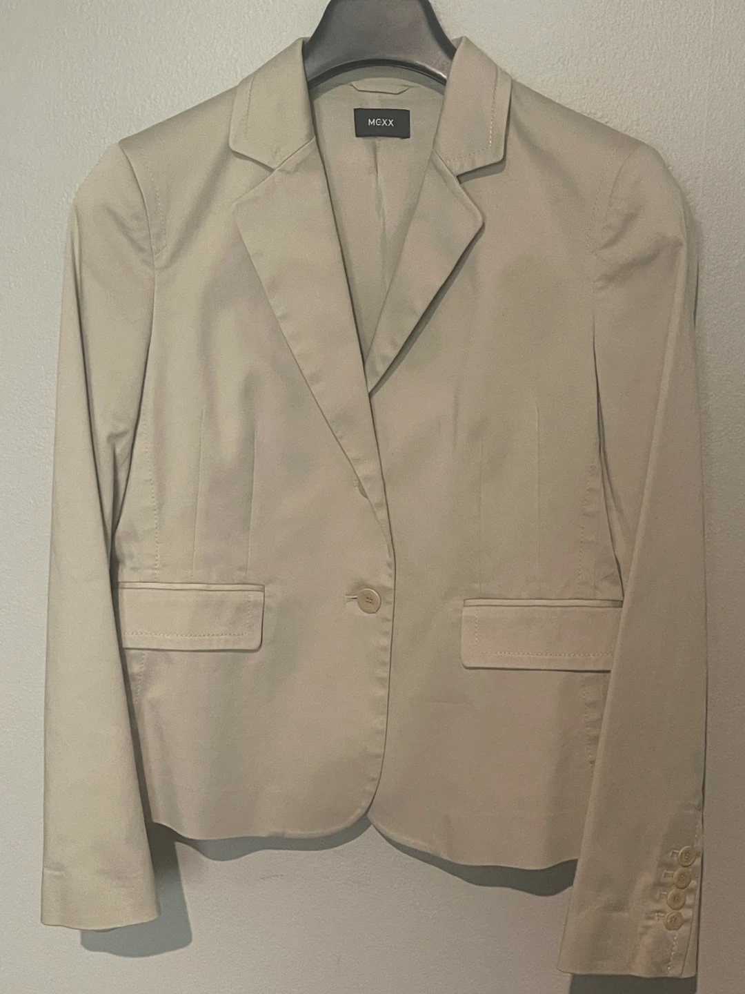 A MEXX blazer in a neutral beige colour! It's a classic piece that would be a great addition to any wardrobe. Perfect for dressing up or down, this blazer is in great condition and ready for a new home!