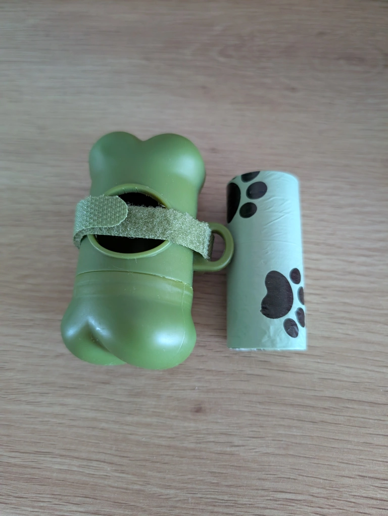 Keep your walks tidy with this adorable green dog waste bag dispenser! It's shaped like a bone and comes with a roll of bags with paw prints on them. Perfect for any dog owner!