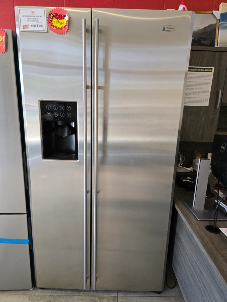 Selling a GE Monogram side-by-side refrigerator in stainless steel. It's a stylish and functional addition to any kitchen