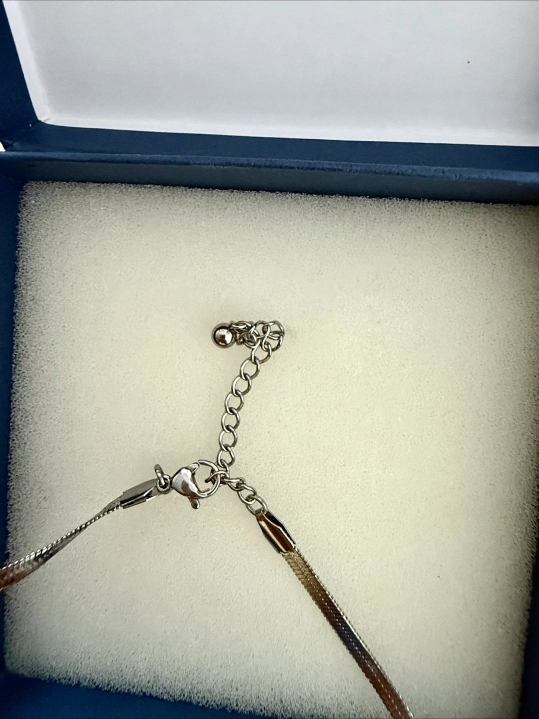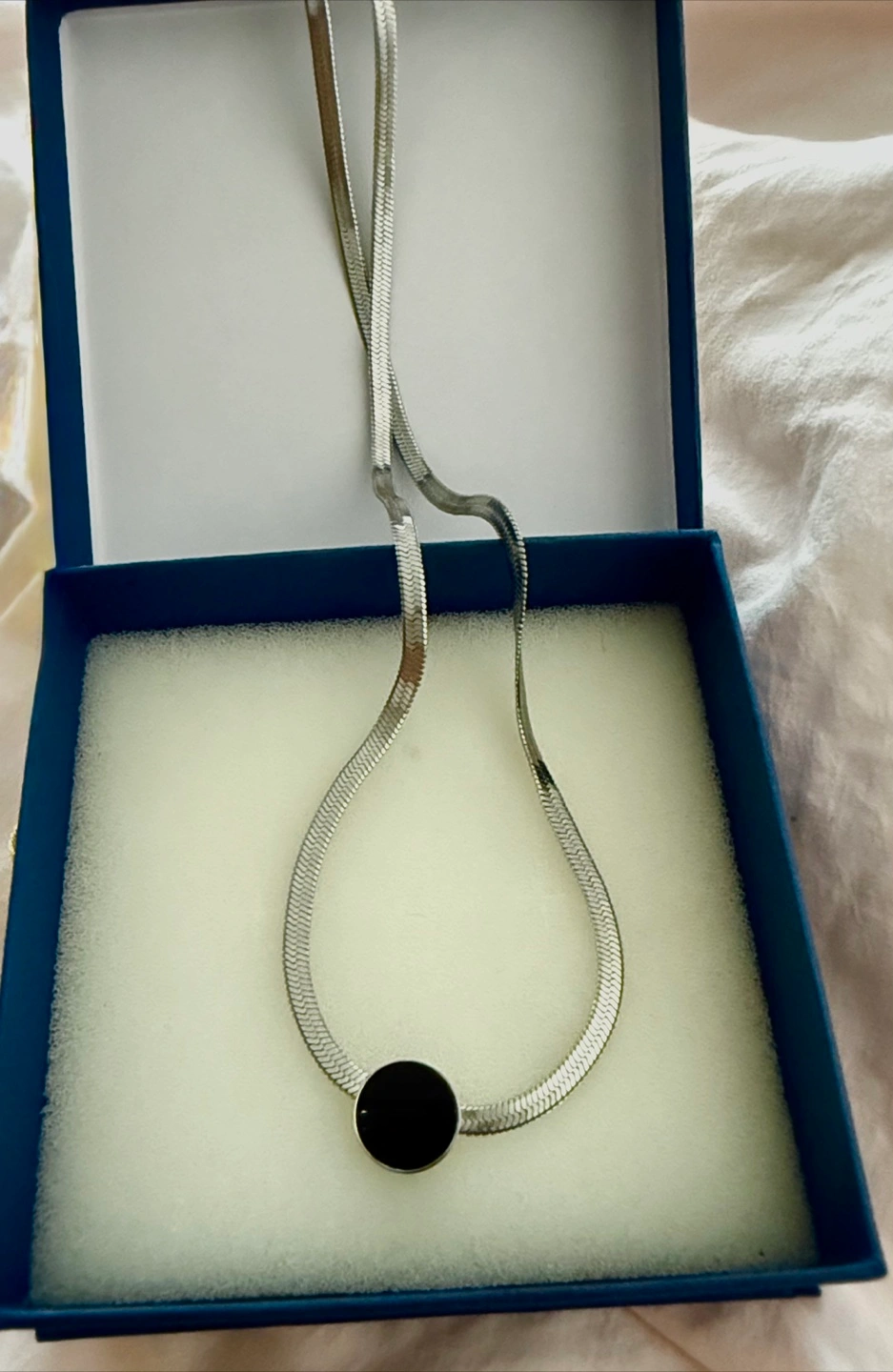 Selling a stylish silver herringbone necklace featuring a unique black circular detail. It comes in its original box, making it perfect for gifting or keeping it safe when not wearing it. The necklace has an adjustable chain for a comfortable fit. It's brand new and ready to add a touch of elegance to any outfit