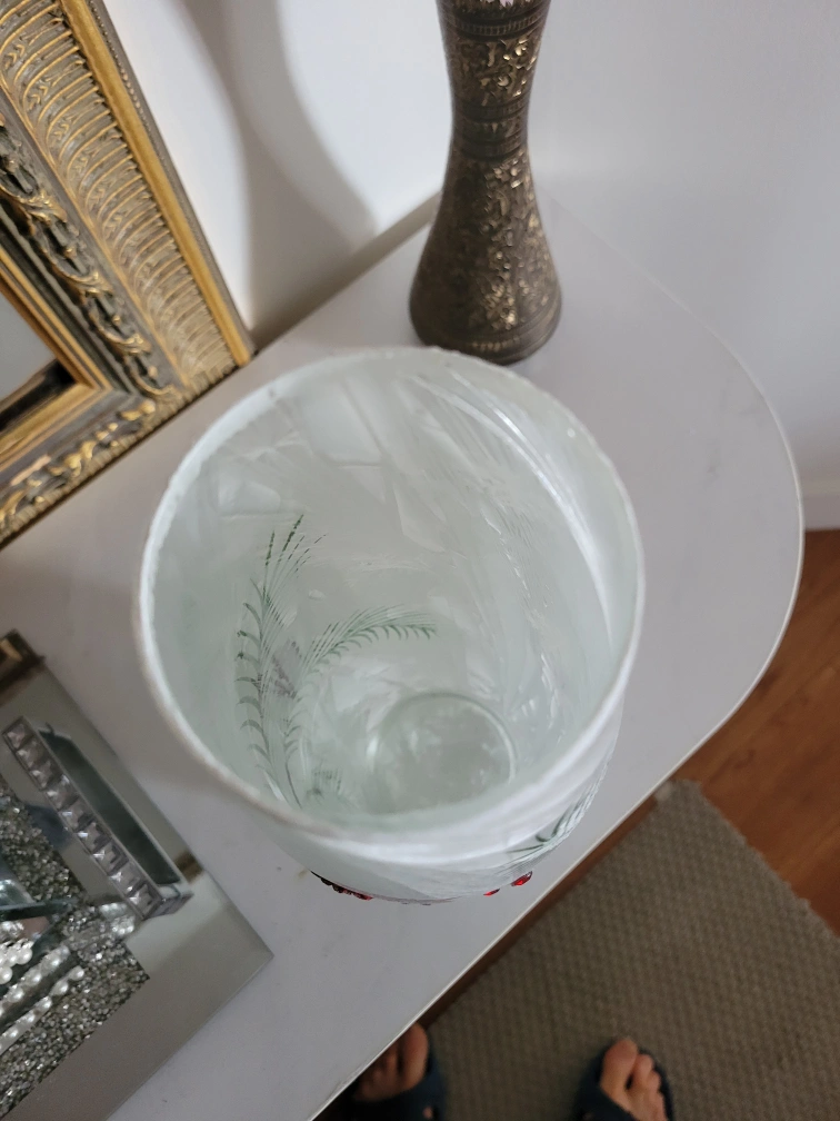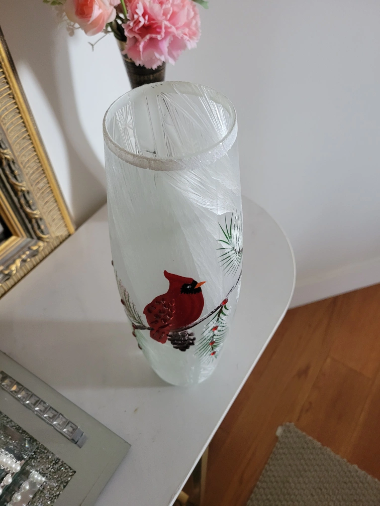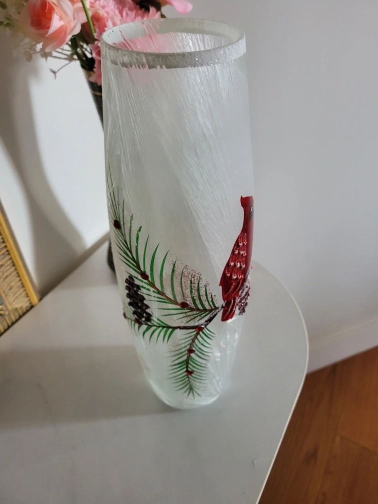 Evergreen Glass Flower Vase Handpainted Cardinal and Pinecones LED Cylinder, 3.9'' x 3.9'' x 12'' inches A lovely vase featuring a cardinal design, perfect for adding a touch of nature to your home decor! It has a frosted texture and is in great condition. Ideal for displaying flowers or as a standalone decorative piece