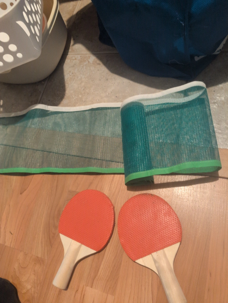 Selling a mini ping pong set that includes two paddles and a net. Perfect for some fun at home or on the go!