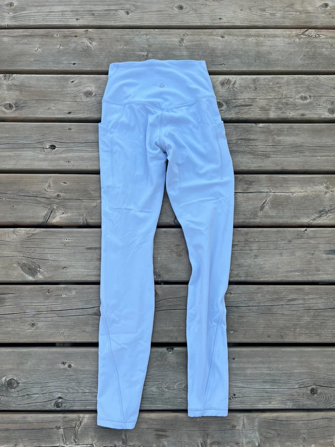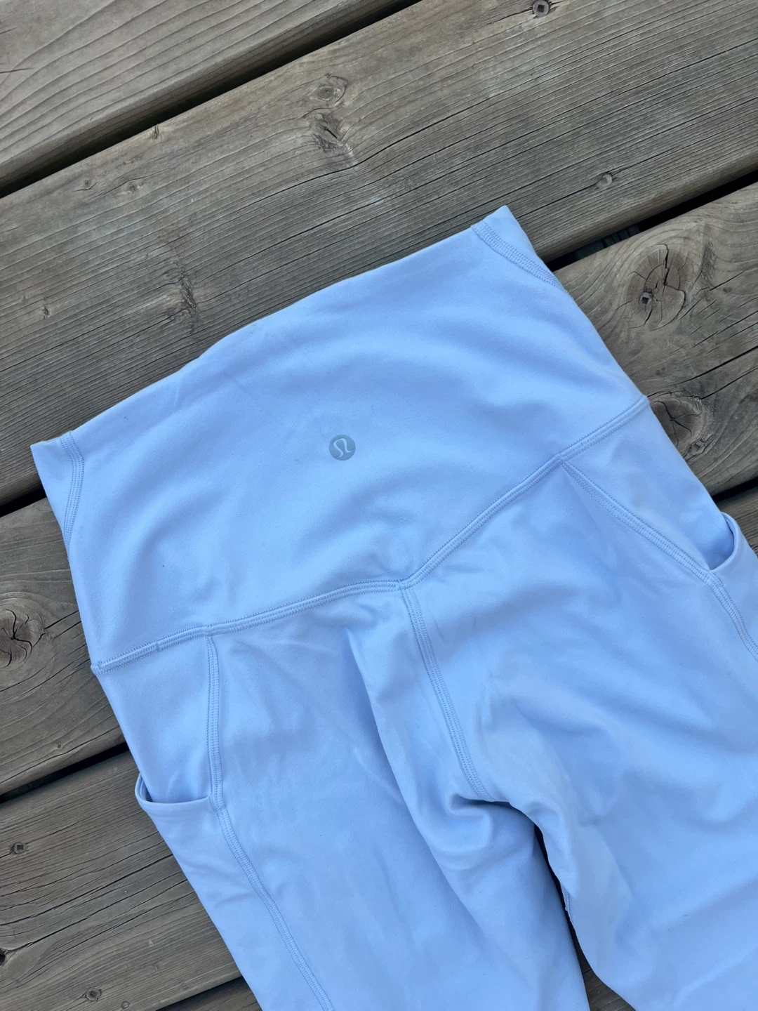 Selling a pair of Lululemon Align high-rise pants with pockets. They're in a lovely light blue colour. These pants are super comfy and great for workouts or just lounging around