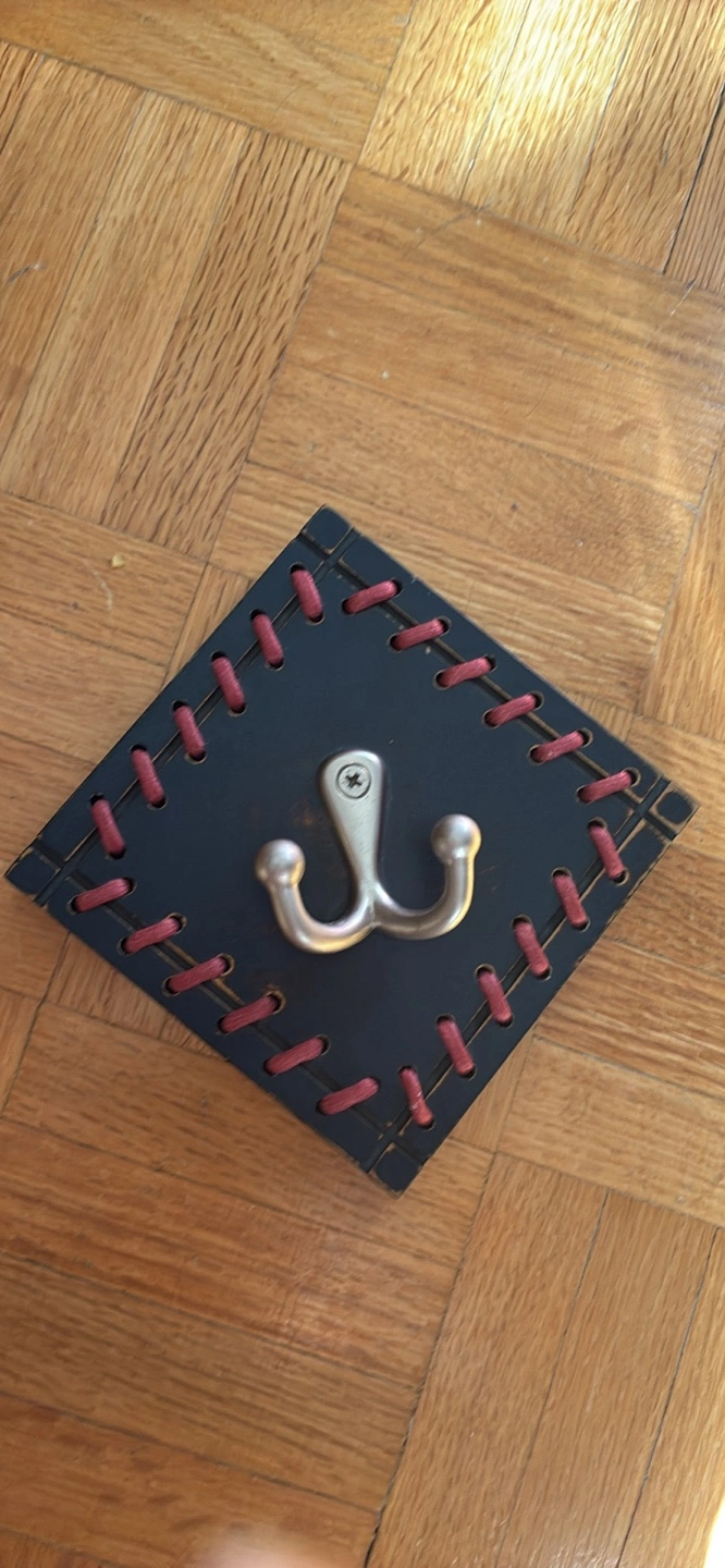 Here is a wall mounted coat hook. It has a square, dark-coloured base resembling a baseball diamond with a metal hook. The edges of the base are decorated with a red stitched pattern. Perfect for adding a touch of rustic charm to your entryway or closet!