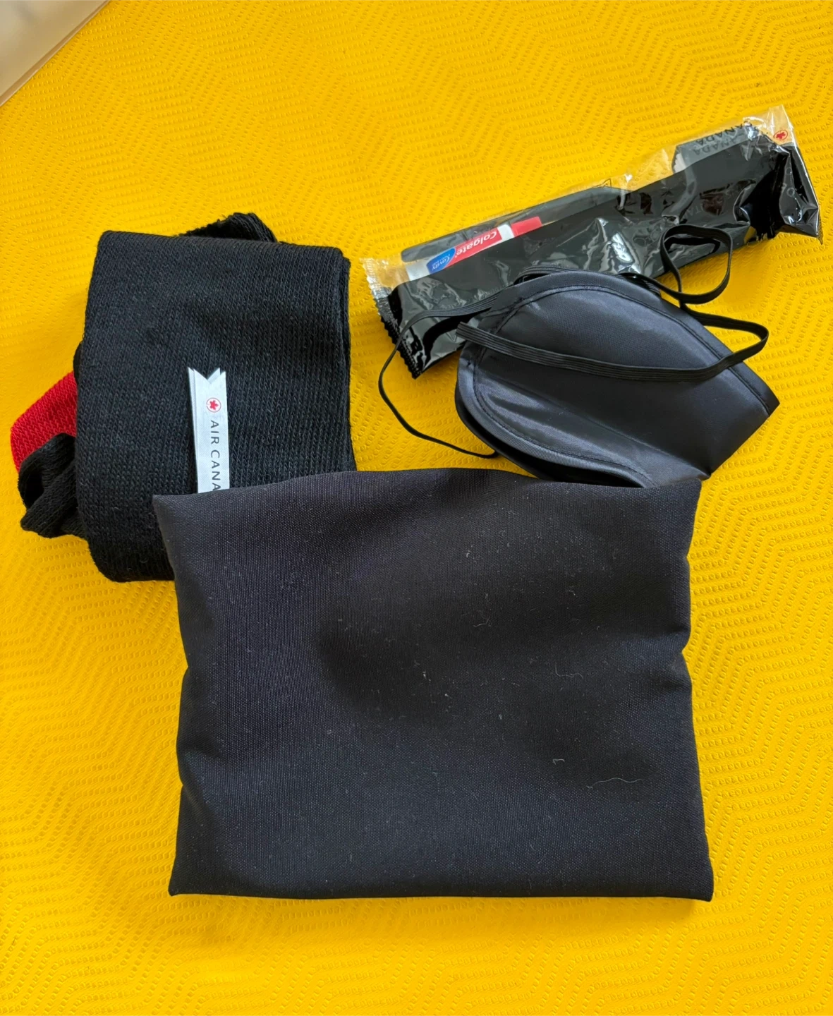 Giving away an Air Canada travel kit (never used). It includes a small black pouch, socks, a Colgate toothbrush, and an eye mask. Perfect for your next trip! Click on my name and scroll down to see my other listings and pickup locations.