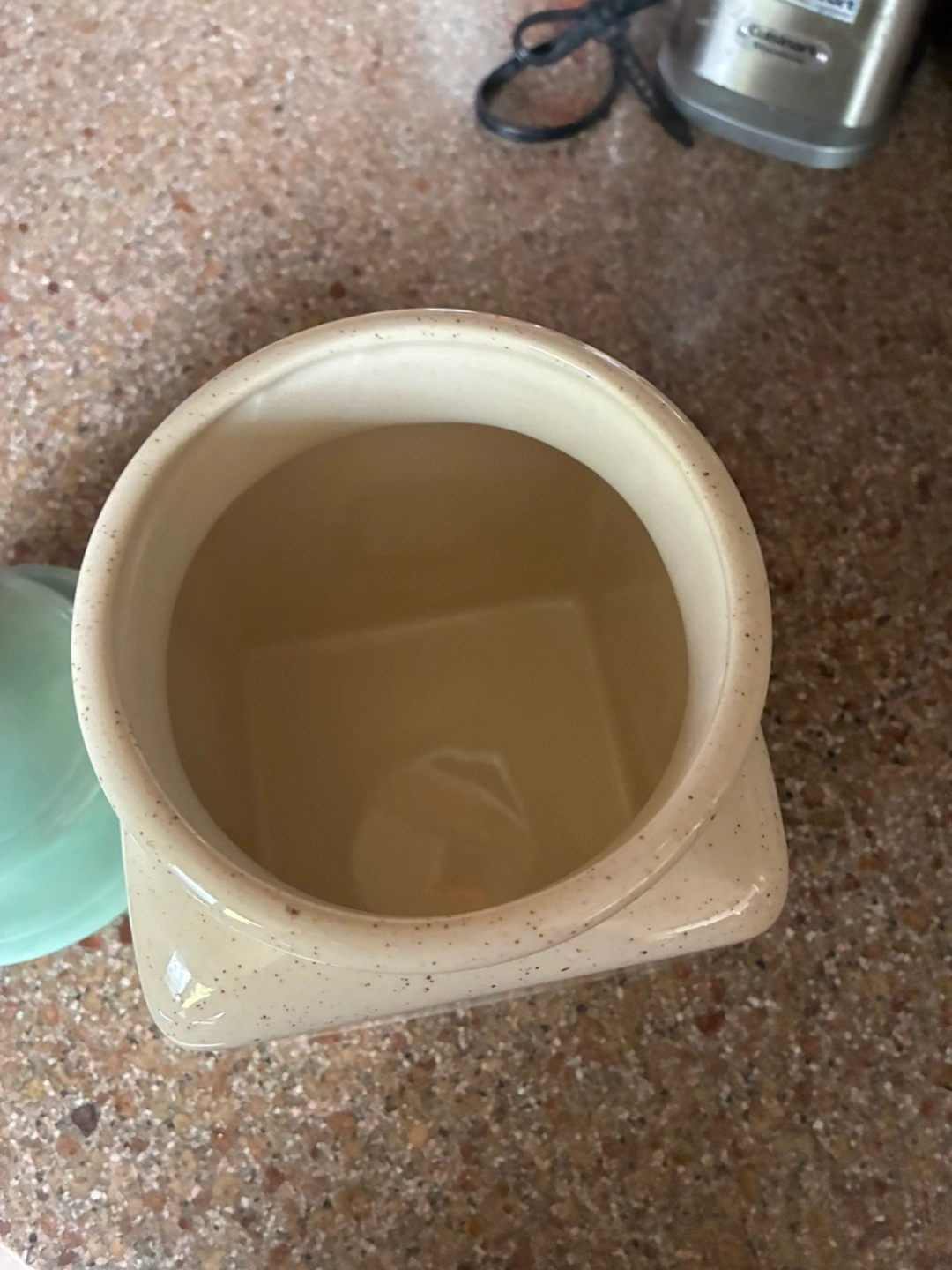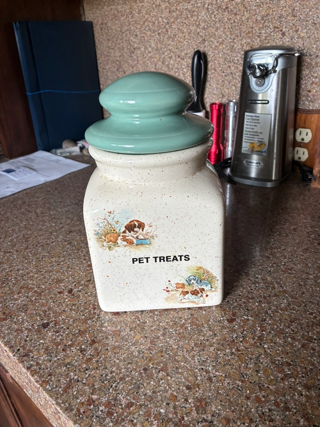 Ceramic pet treat jar with a cute design! It has a light green lid and is in great condition. Perfect for storing your furry friend's favourite snacks