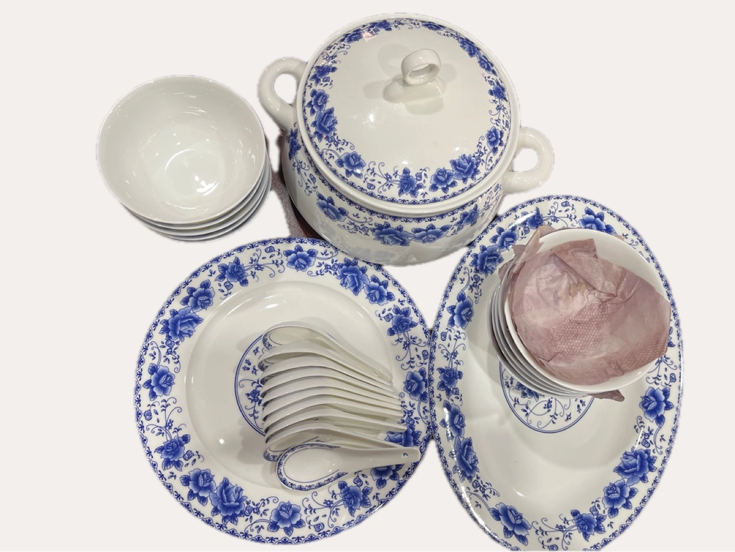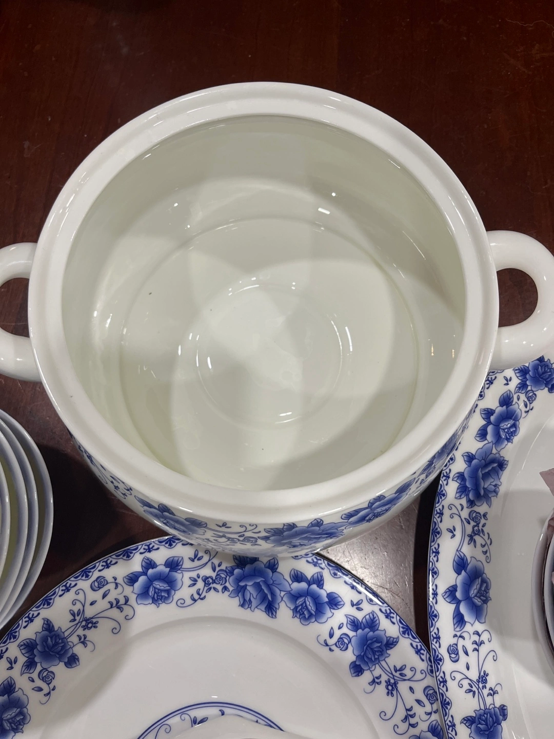 Here's a lovely new dinnerware set with a beautiful floral design! It includes plates, 10 bowls, a soup tureen with a lid, and 10 spoons. Perfect for adding a touch of elegance to your dining table