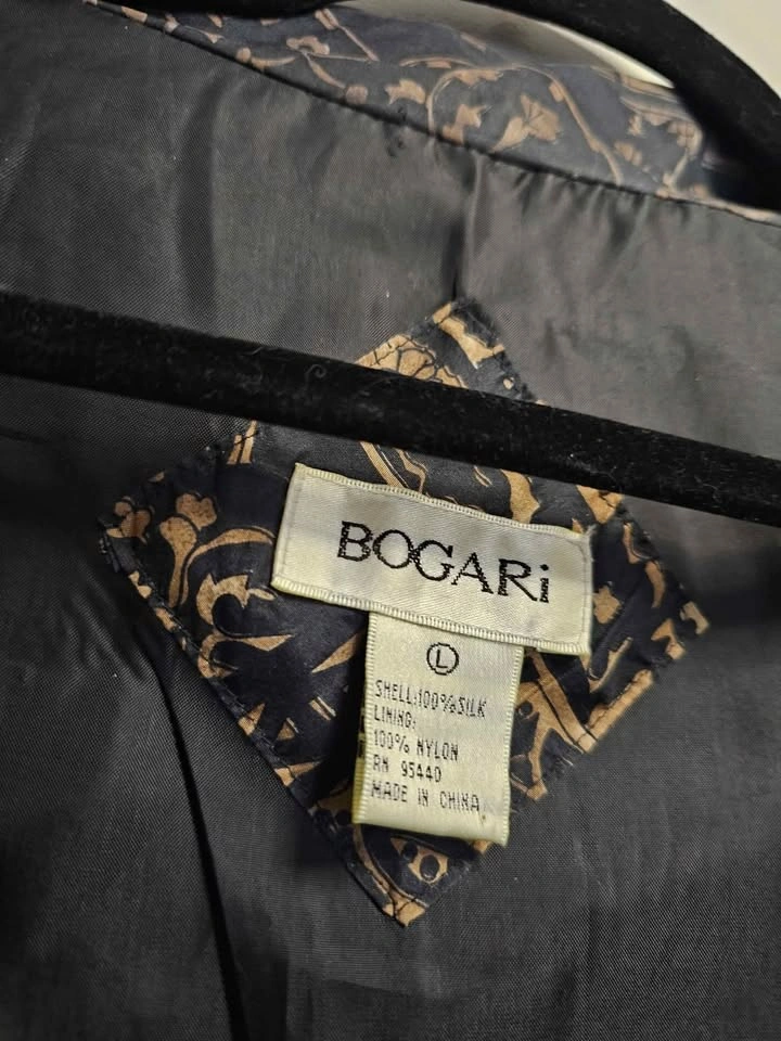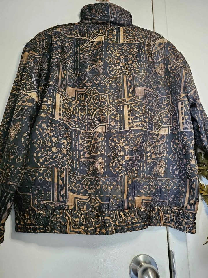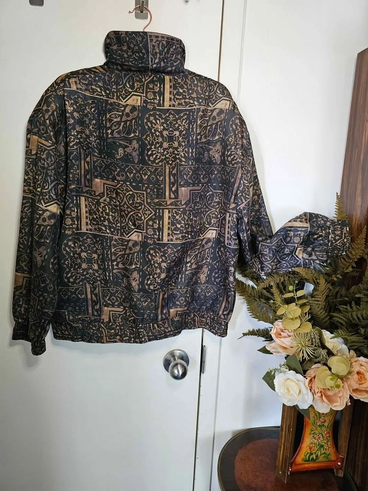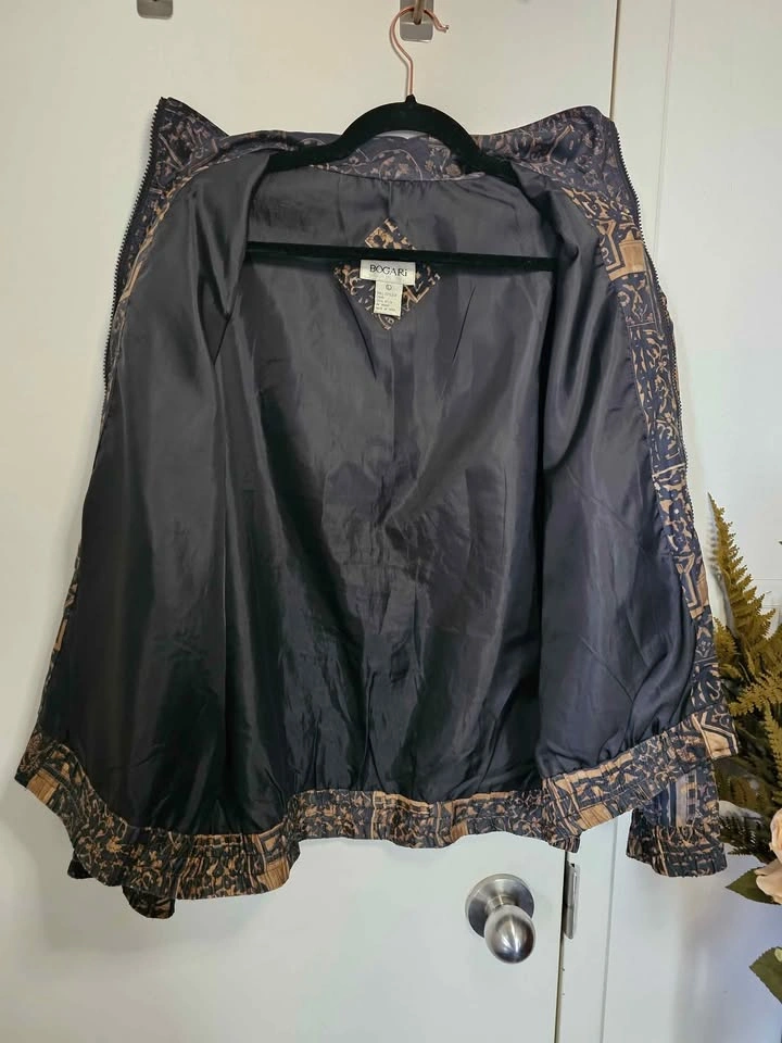 Beautiful vintage 100% silk lightweight bomber style zip up jacket, in an ornate black and golden brown pattern. Jacket has two front pockets and is lined with a nylon lining. It is not insulated and serves as a light windbreaker that is perfect for spring/ summer/ fall weather. Waist and cuffs are elasticized, but the elastic has mostly stretched out from age. Jacket has light padding in the shoulders, the shoulder pads are much thinner than standard ones. Made by Bogari. Jacket is a size L and is in very good vintage condition. Pit to pit measures about 25", pit to sleeve hem measures about 18", bottom hem measures about 22" across, and shoulder to bottom hem measures about 23". Feel free to message if you have any questions!