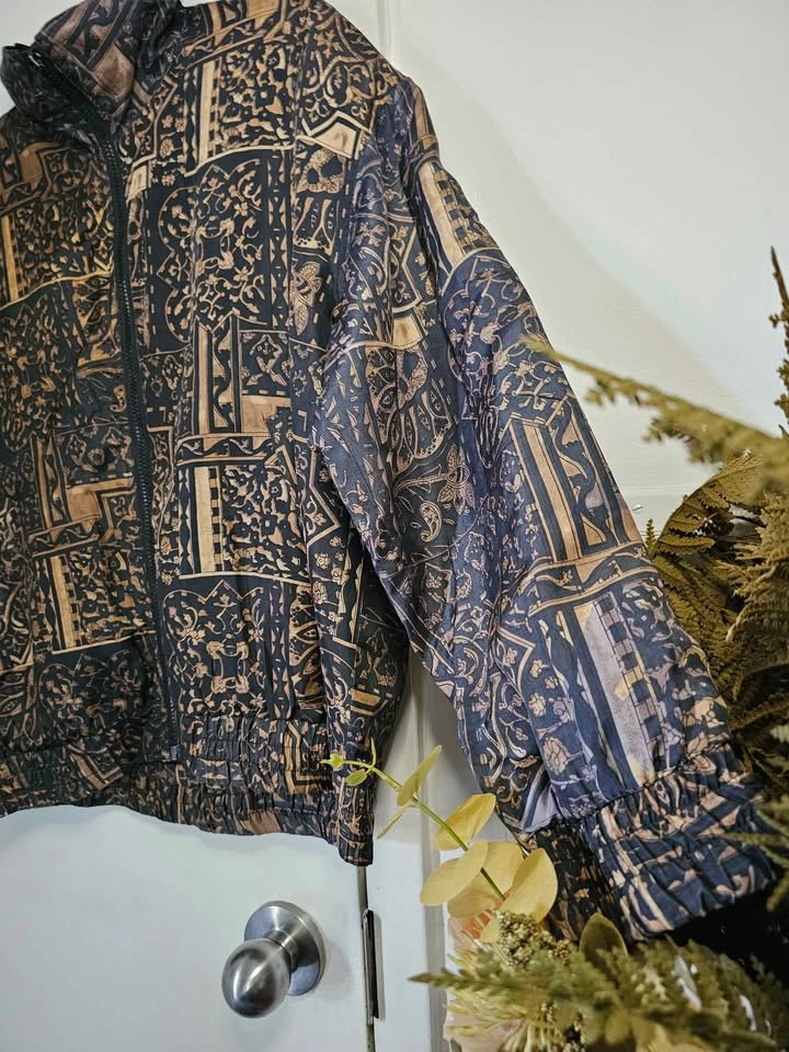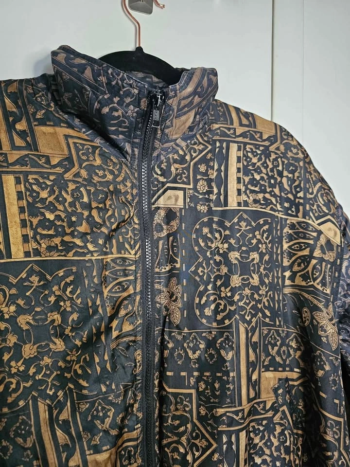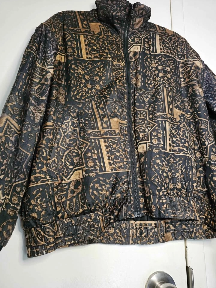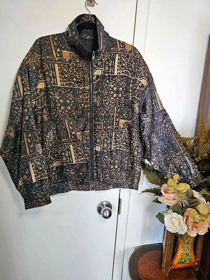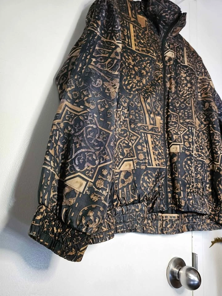 Beautiful vintage 100% silk lightweight bomber style zip up jacket, in an ornate black and golden brown pattern. Jacket has two front pockets and is lined with a nylon lining. It is not insulated and serves as a light windbreaker that is perfect for spring/ summer/ fall weather. Waist and cuffs are elasticized, but the elastic has mostly stretched out from age. Jacket has light padding in the shoulders, the shoulder pads are much thinner than standard ones. Made by Bogari. Jacket is a size L and is in very good vintage condition. Pit to pit measures about 25", pit to sleeve hem measures about 18", bottom hem measures about 22" across, and shoulder to bottom hem measures about 23". Feel free to message if you have any questions!
