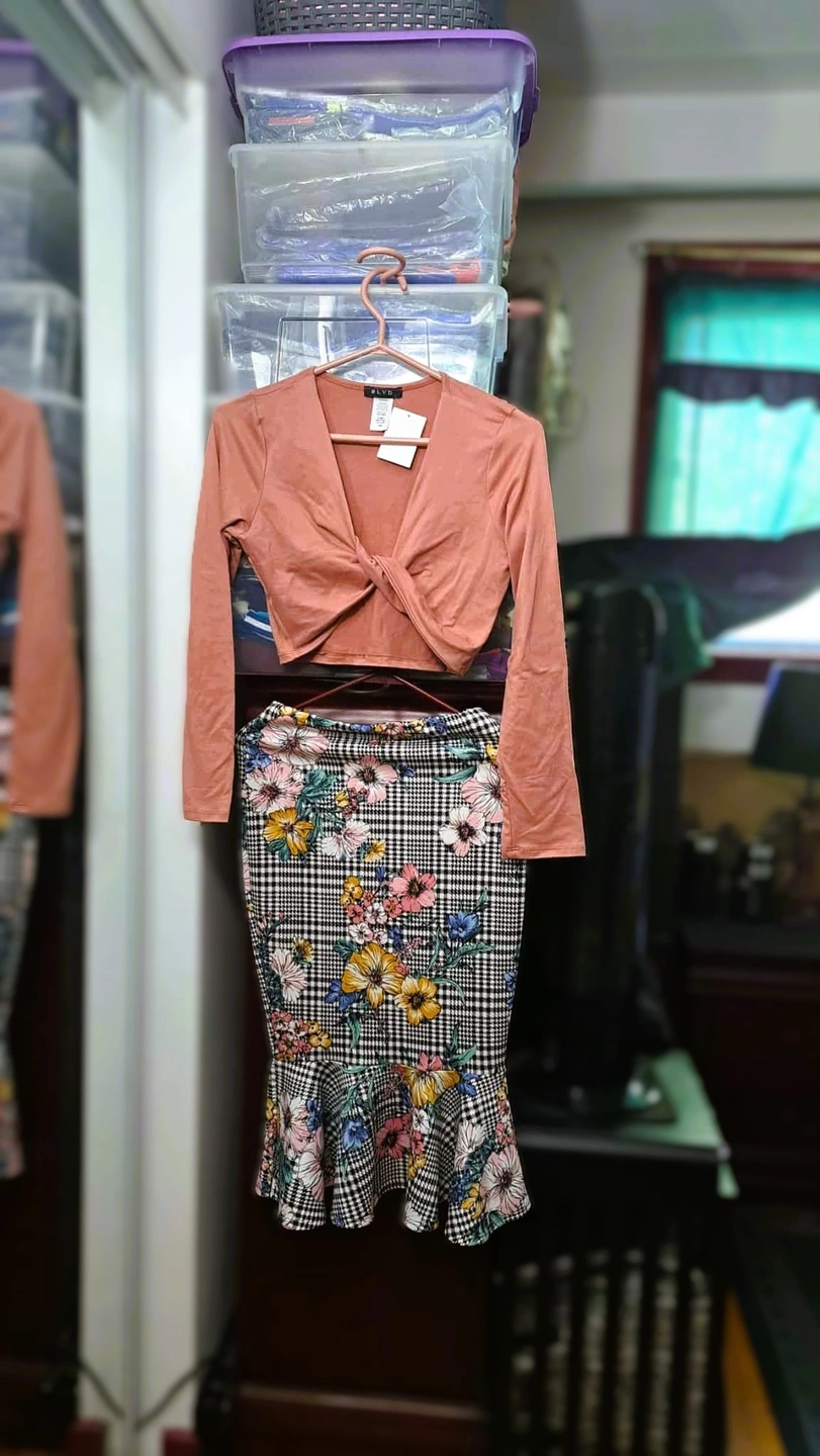 A new made in USA long-sleeved top with twist front V-shaped and have a design which is very stylish. A style that is both casual and elegant, but also comfortable for everyday wear. Fashion trendy casual everyday clothing ideal for both adults and teens throughout the year. Selling Top for $10. Top and skirt can be bought for $20.
