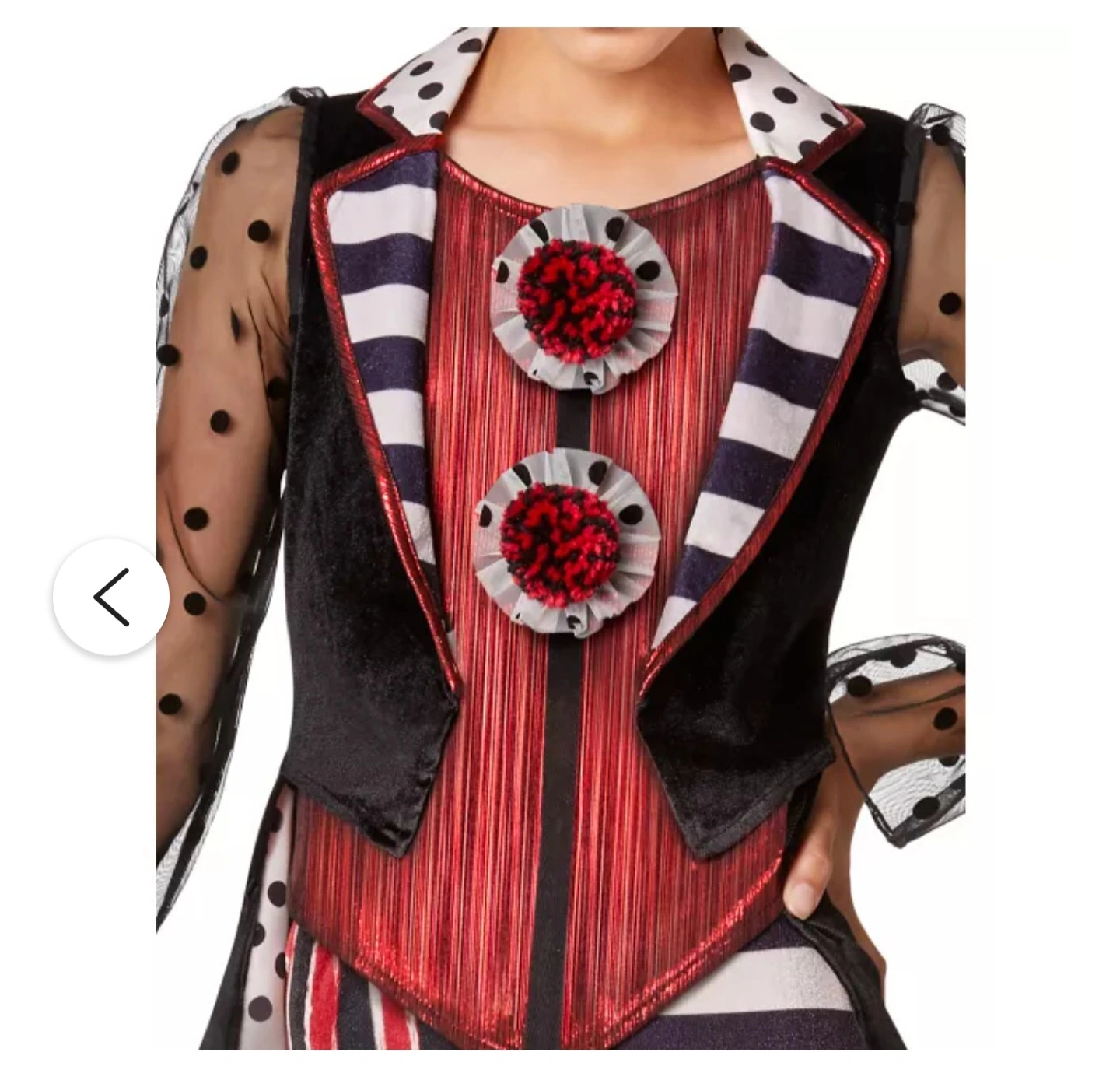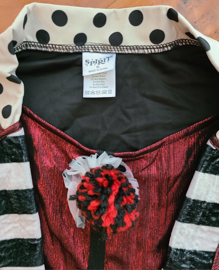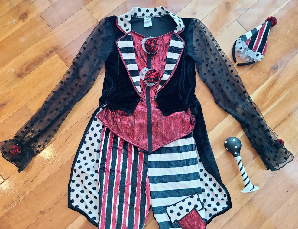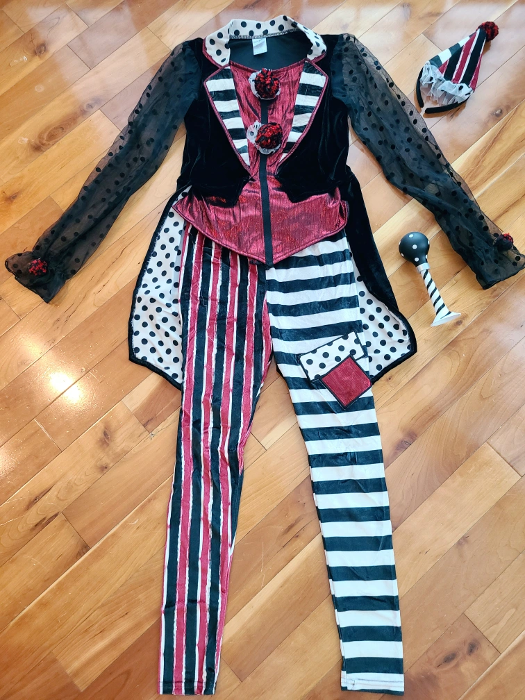 Gently used Spirit Halloween clown costume! It's a size XL and features a unique design with stripes, polka dots, and fun pom-pom details. Includes the jacket, pants, hat, and a fun noise maker accessory. Perfect for a spooky and stylish Halloween!