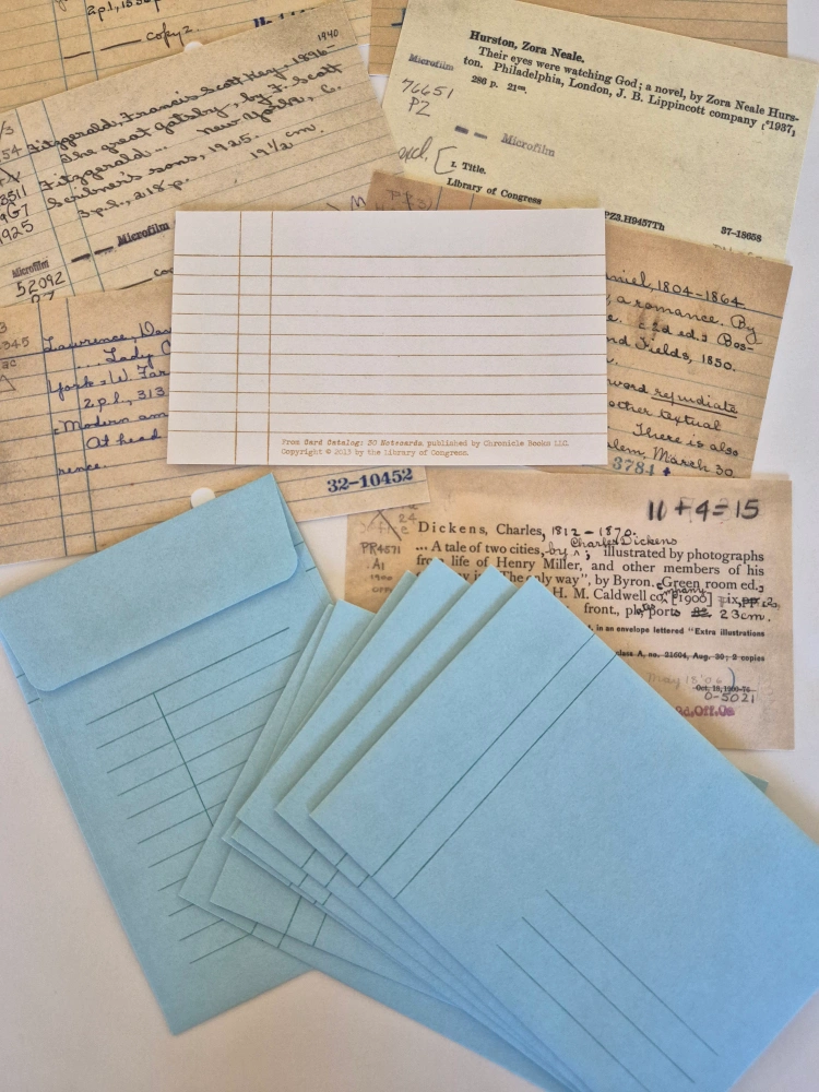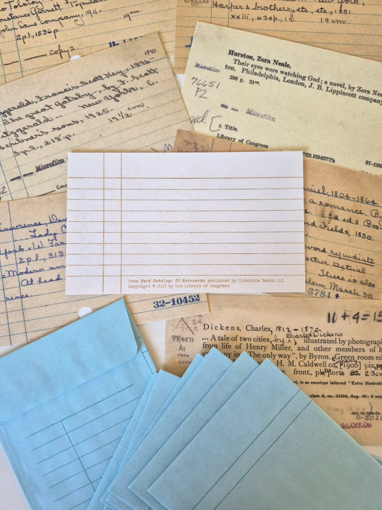 New notecards featuring images of vintage card-catalog cards. These are reproductions of actual cards. Set of 8. Books & Authors are: • James Joyce: Ulysses, • Charles Dickens: A Tale of Two Cities, • F. Scott Fitzgerald: The Great Gatsby, • Herman Melville: Moby Dick, • Leo Tolstoy: War and Peace, • Nathaniel Hawthorne: The Scarlet Letter, • D. H. Lawrence: Lady Chatterley's Lover, and • Zora Neale Hurston: Their Eyes Were Watching God. 📷 Photos show fronts & backs of cards and envelopes. 📏 These are the size of the original index cards (3" x 5"), and there are lines on the back for writing your message. ✉️ They come with nice envelopes, light blue and lined on both sides! 🌟 Brand new. 👉 Pick up from Yonge & St Clair or I can post these to you (at cost)