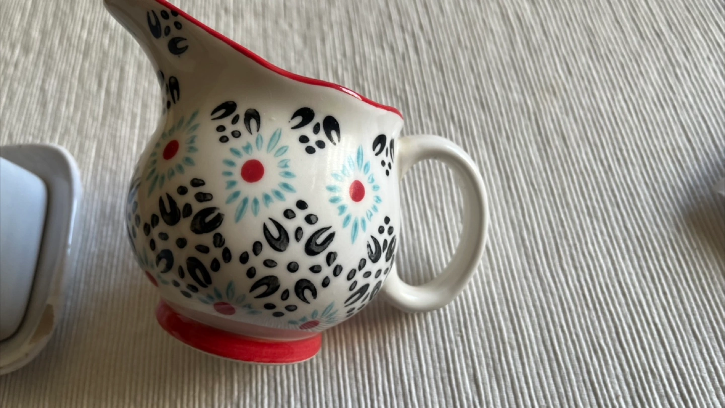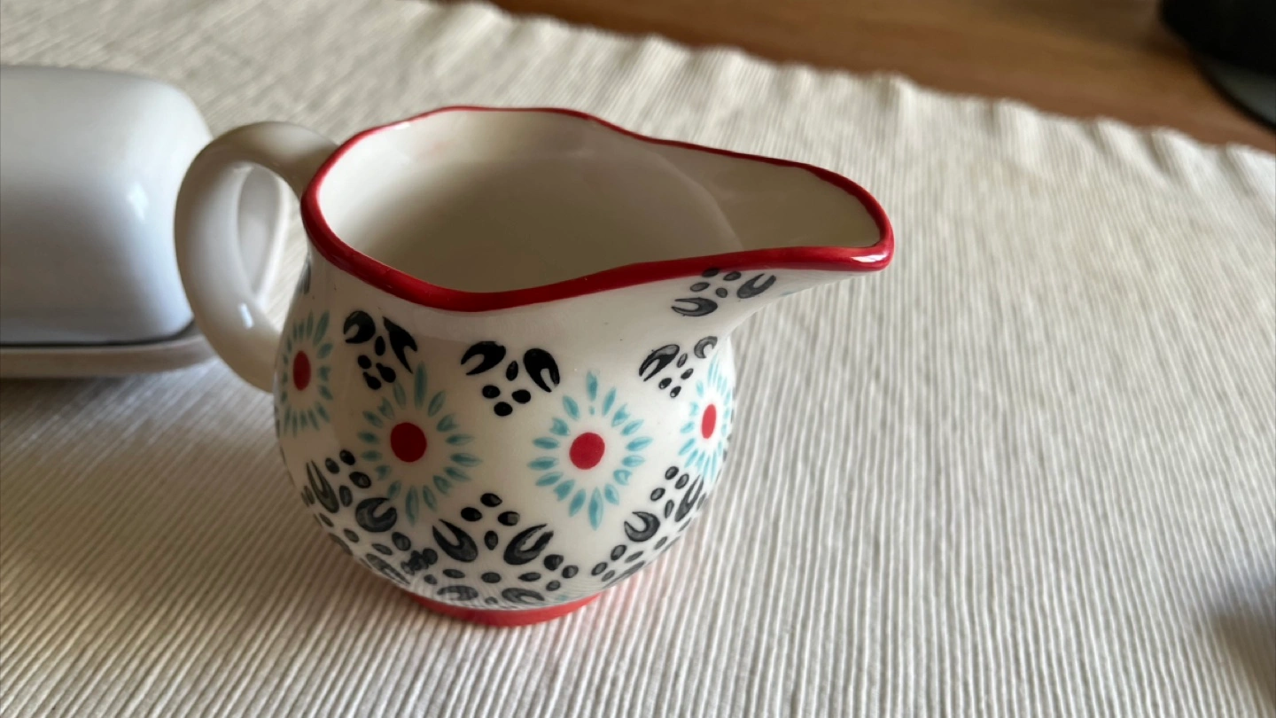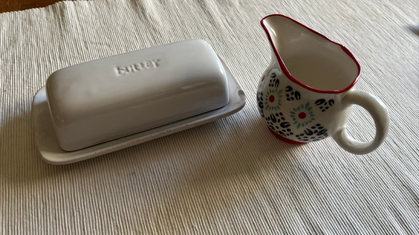 Selling a cute butter dish with the word "butter" embossed on the lid and a matching creamer. The creamer has a lovely floral design with red trim. There's a small chip on the butter dish, as shown in the photos, but otherwise they are in good condition!