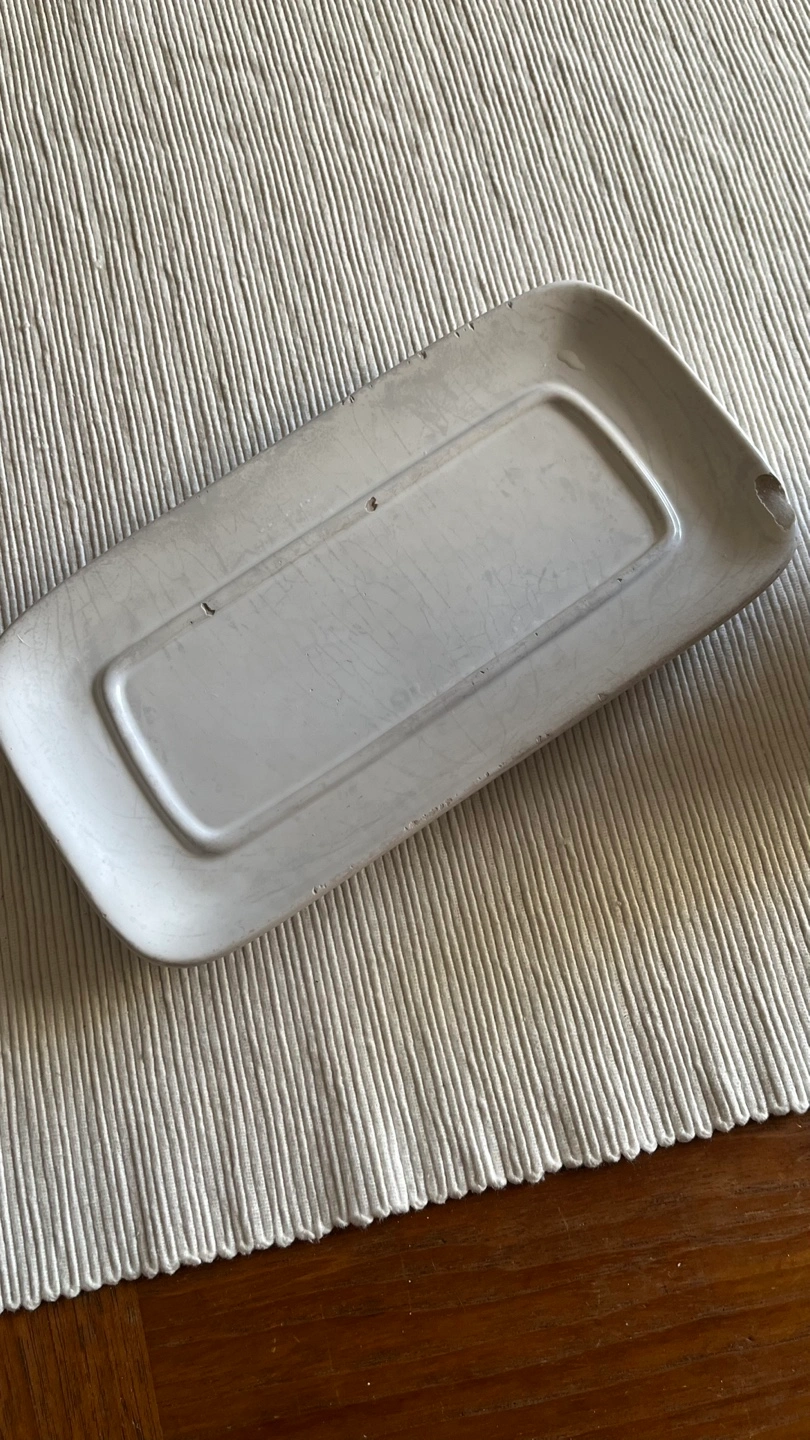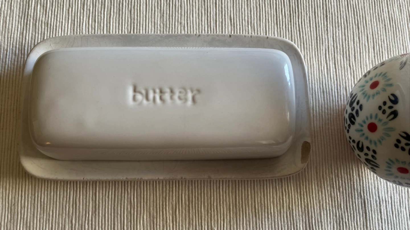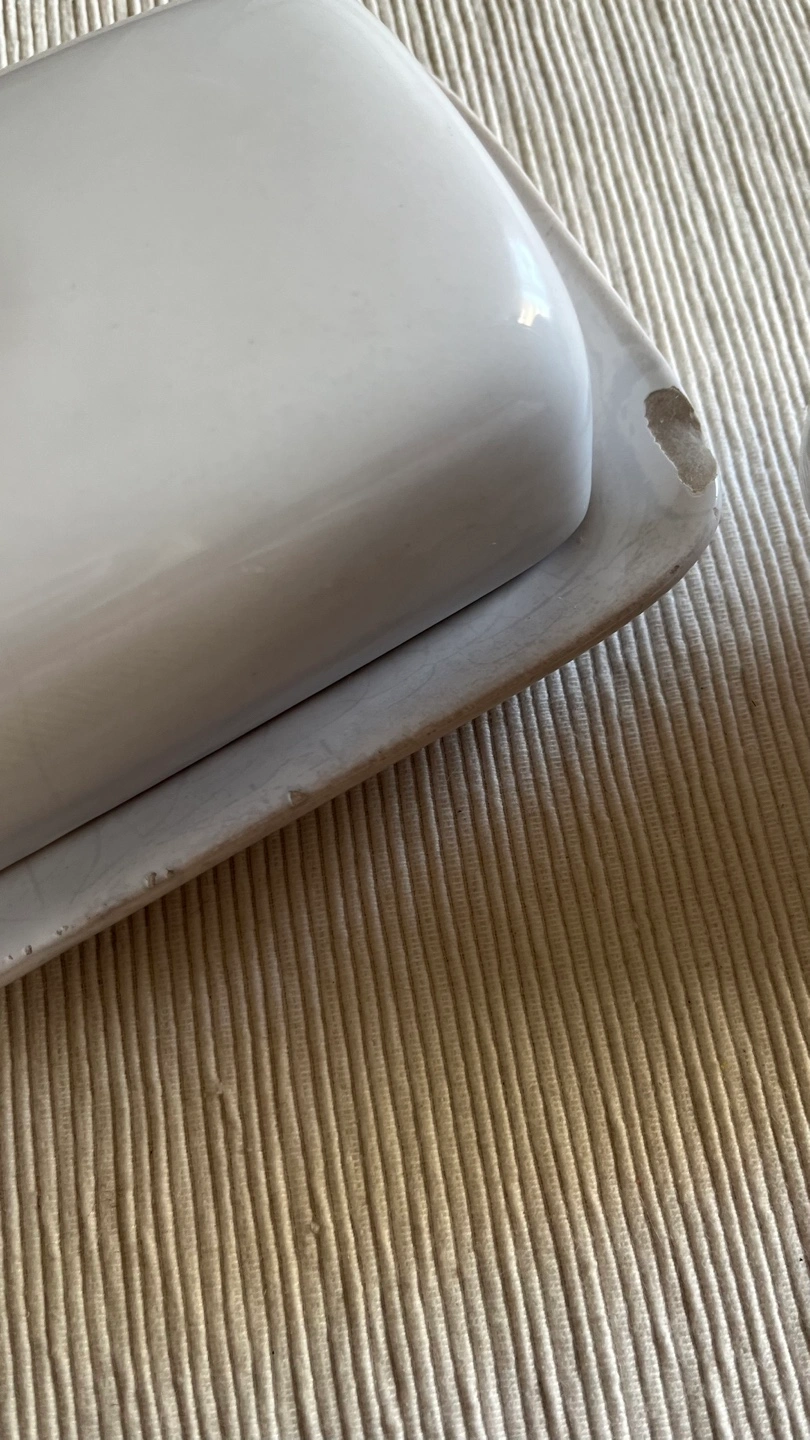 Selling a cute butter dish with the word "butter" embossed on the lid and a matching creamer. The creamer has a lovely floral design with red trim. There's a small chip on the butter dish, as shown in the photos, but otherwise they are in good condition!