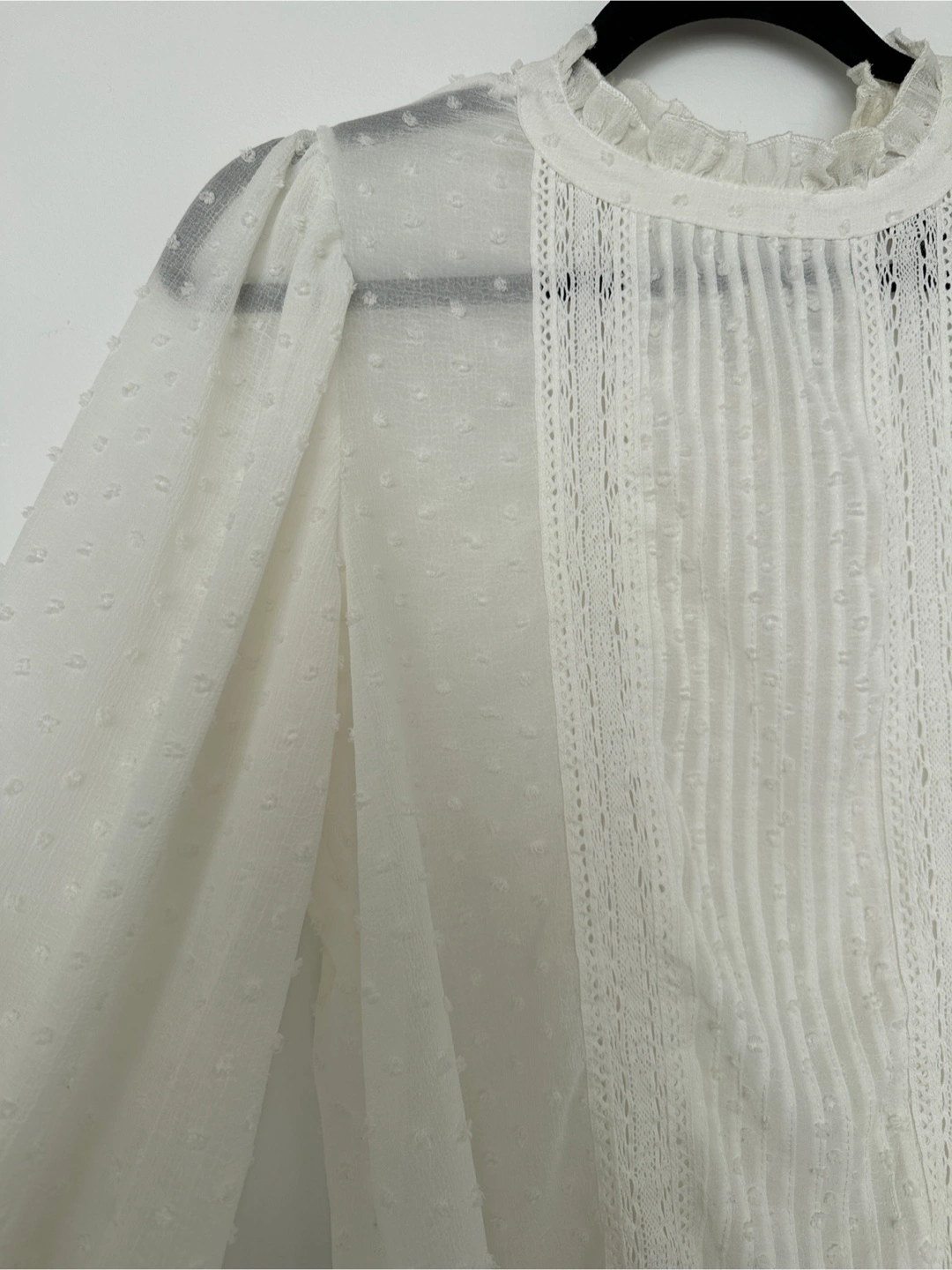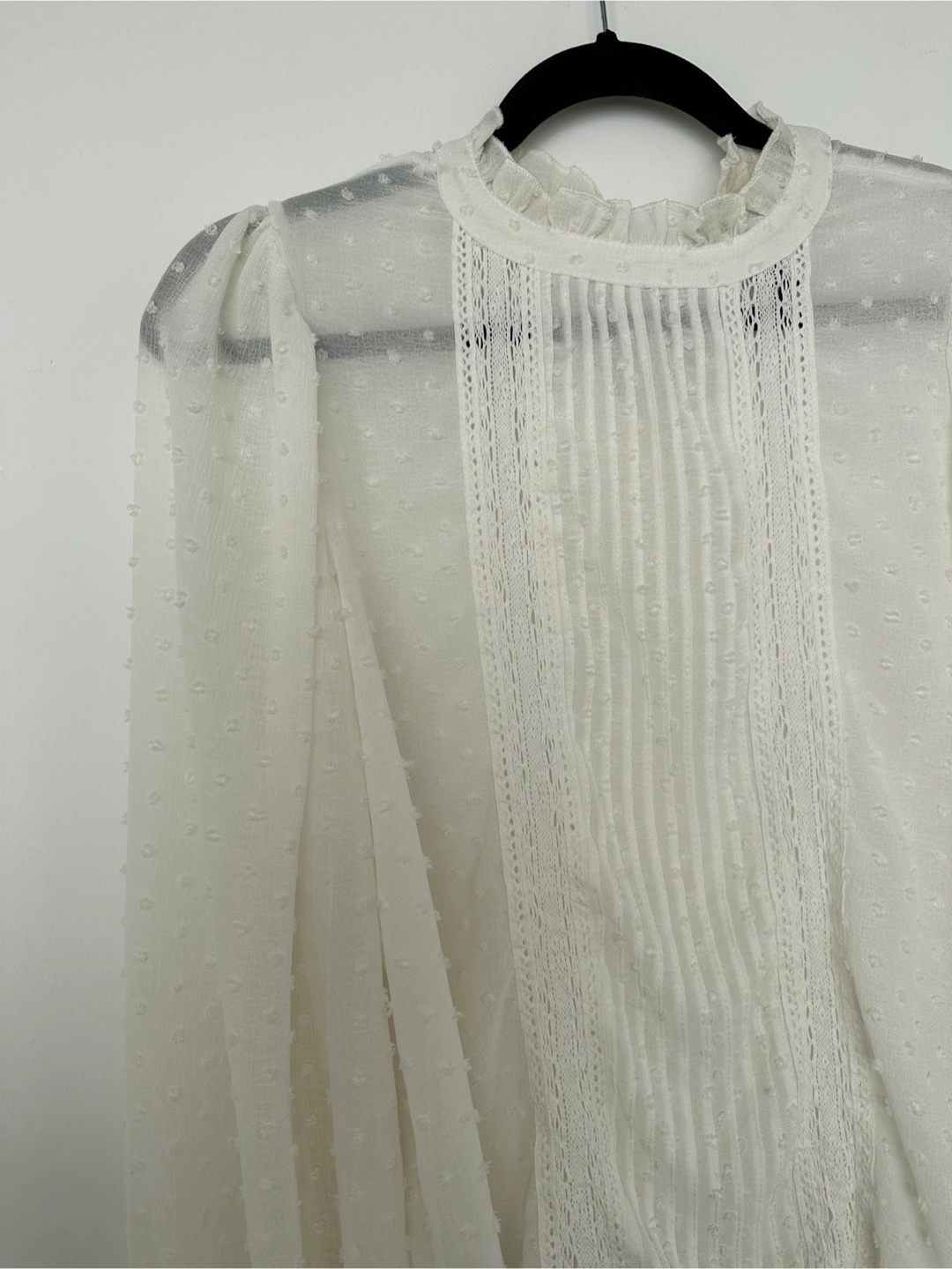 Here's a lovely white long-sleeve blouse! It features a delicate lace detail and a ruffled collar. Perfect for adding a touch of elegance to any outfit ⭐️Open to Bundle and trade for any of your listings