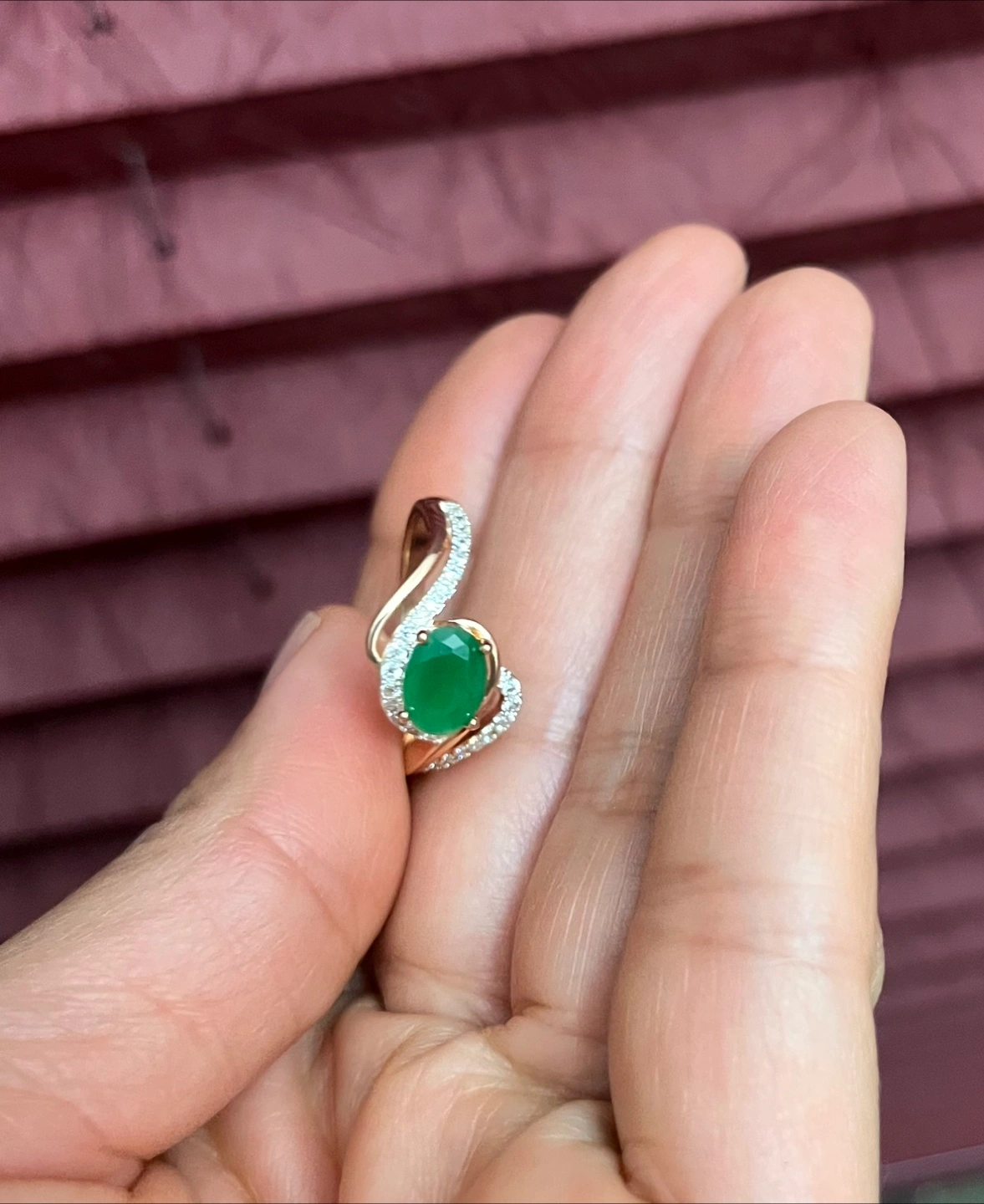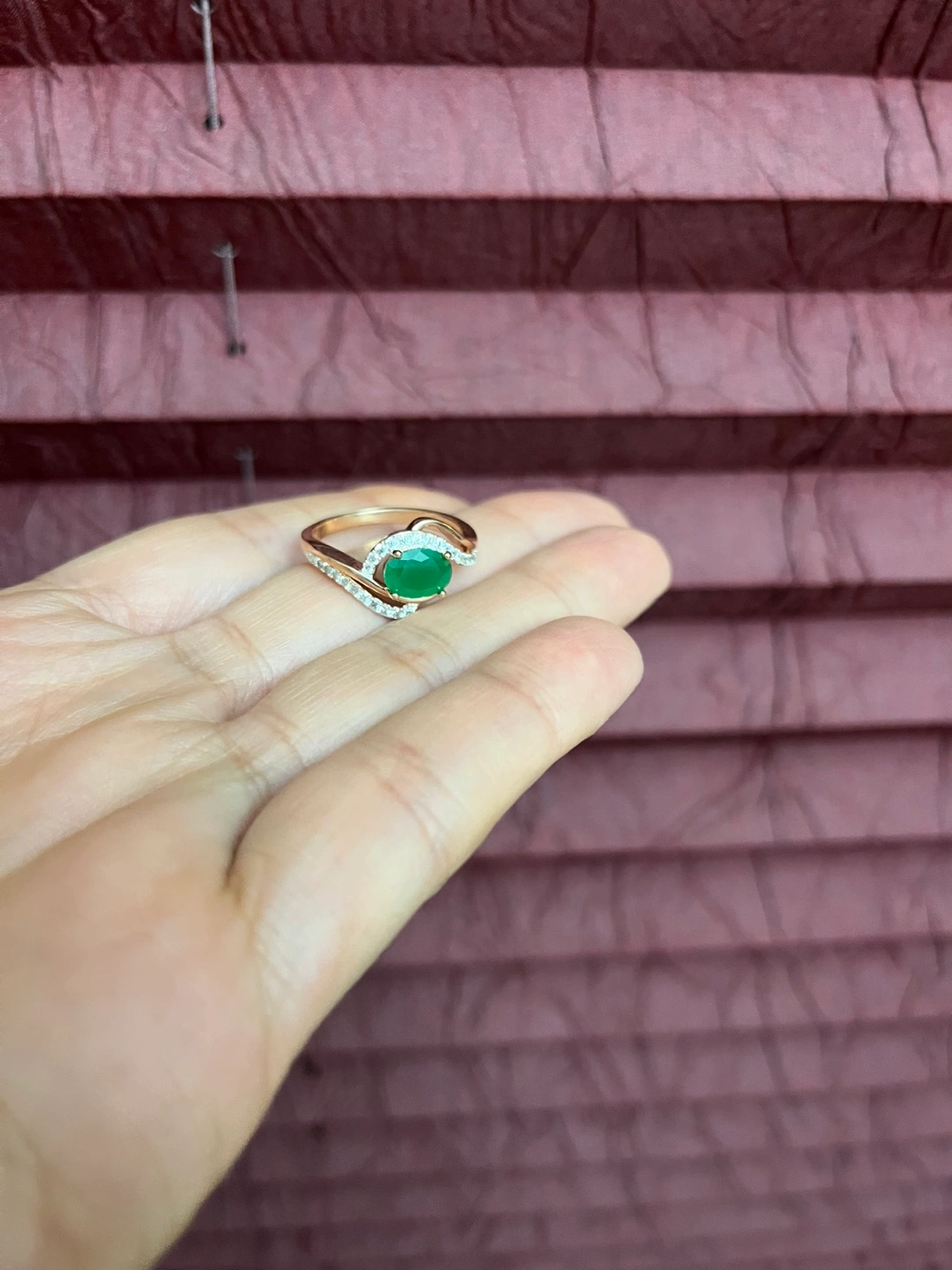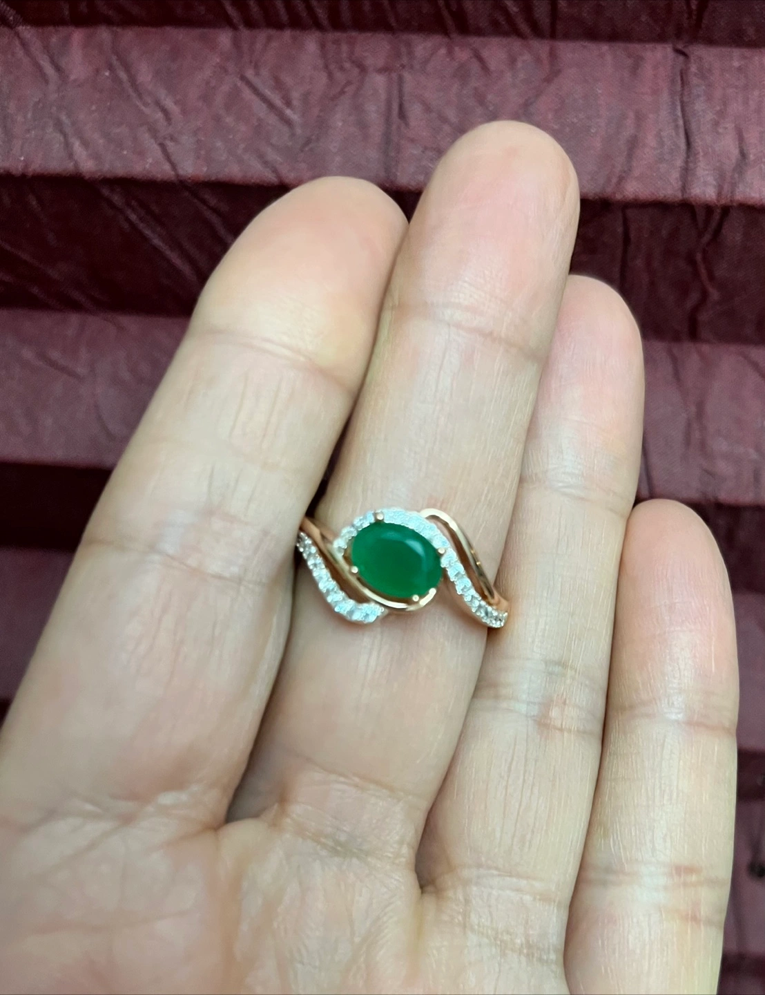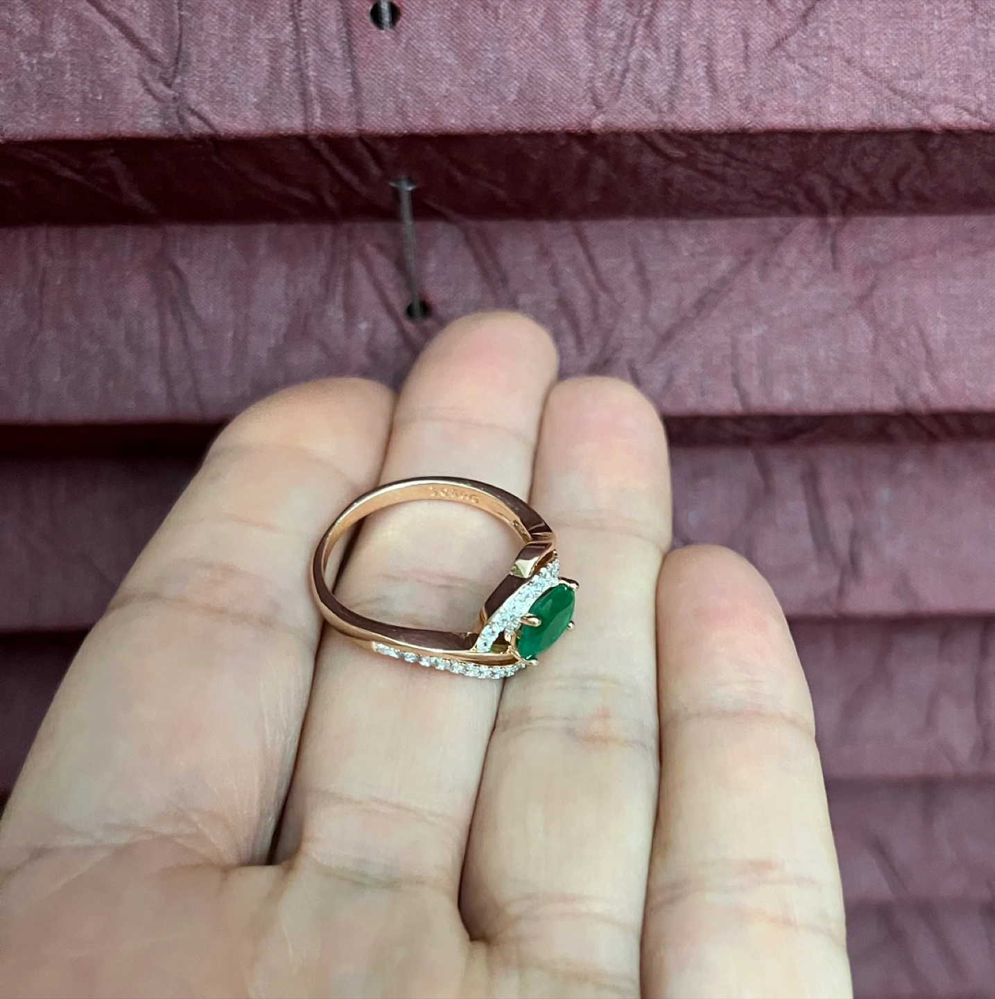 Beautiful ring featuring a vibrant green jade inspired stone surrounded by sparkling diamonds. Rose gold plated Size 9