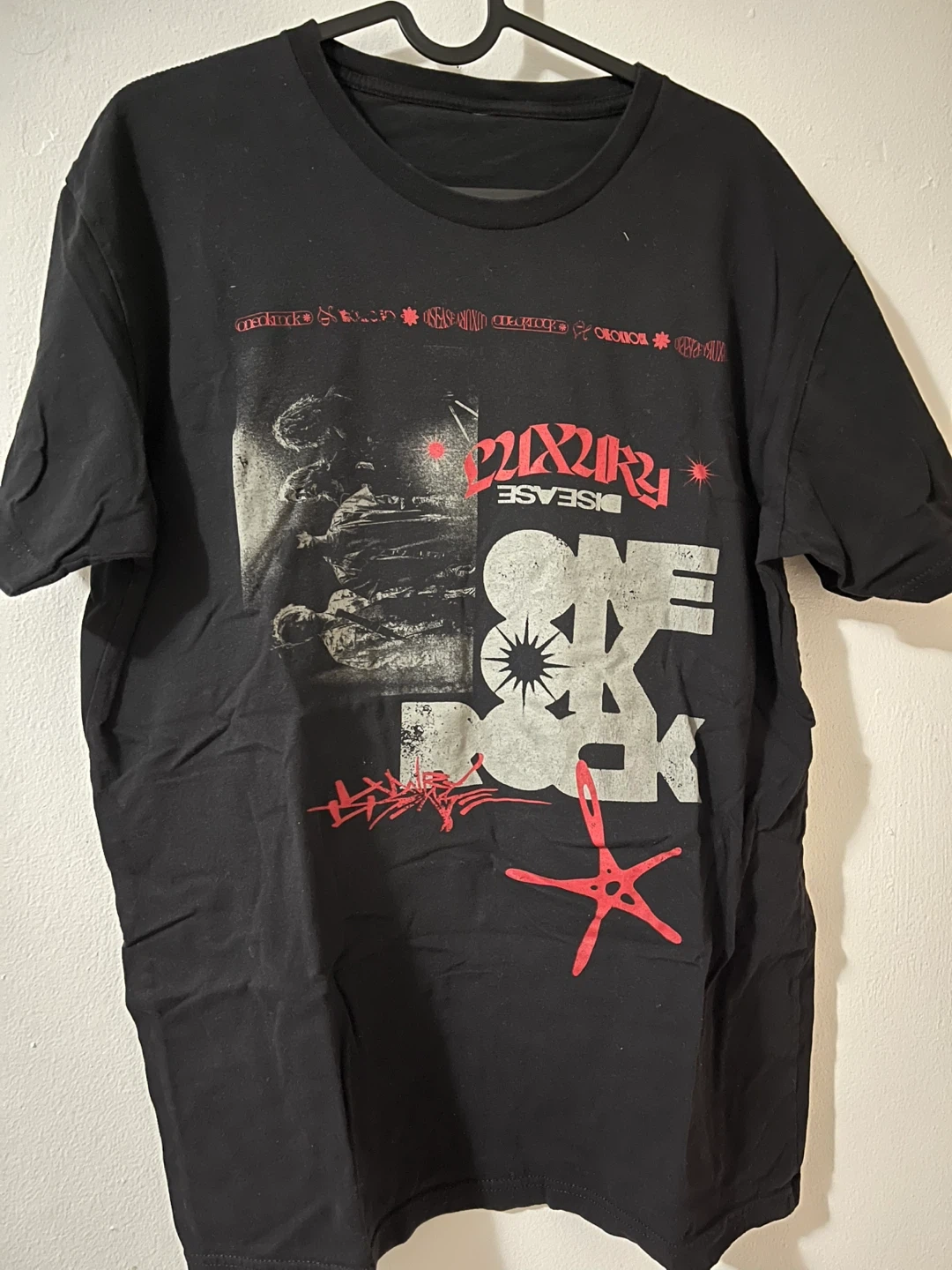Selling a black One Ok Rock t-shirt. The design features a graphic print with the words 'Luxury Disease' and the band's name. It's in great condition and ready for a new home!