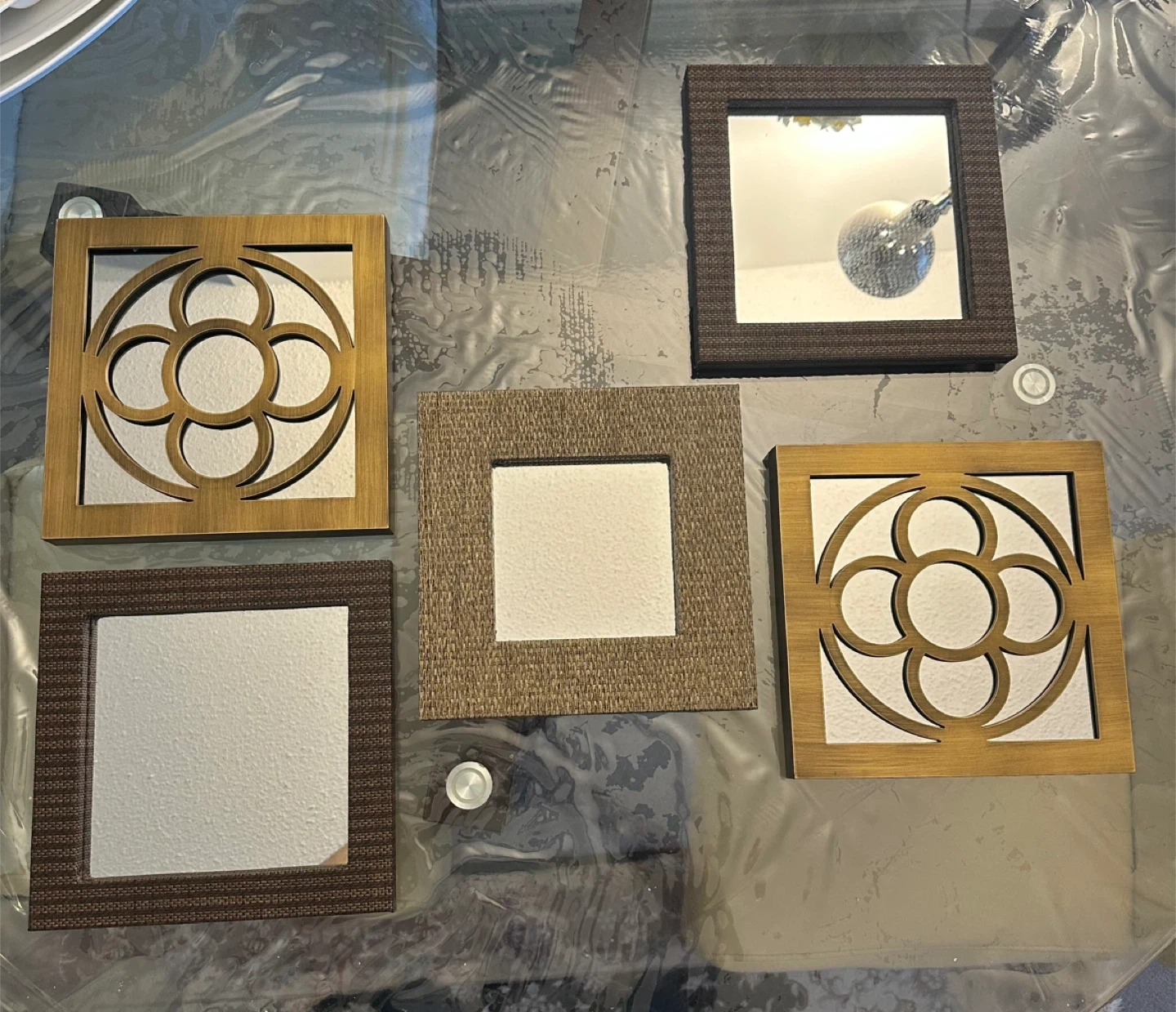 Selling a set of five decorative wall mirrors. They're in great condition and would add a nice touch to any room. The frames are a mix of brown and gold tones with varying textures and designs, including some with a floral pattern. Perfect for creating a gallery wall or adding a bit of flair to your space