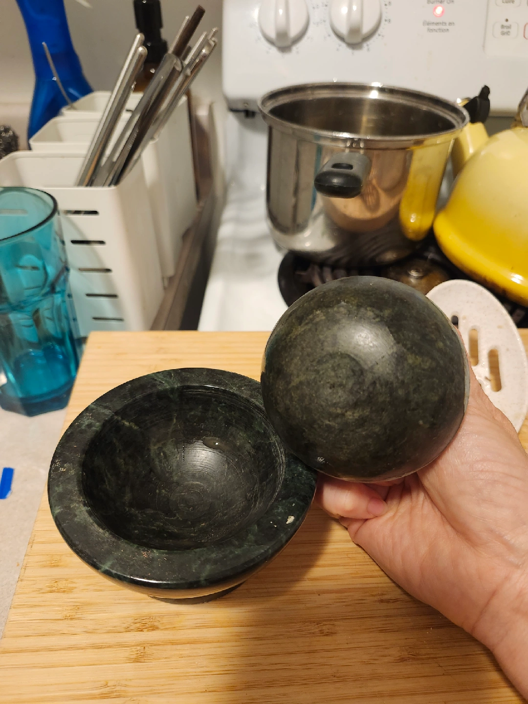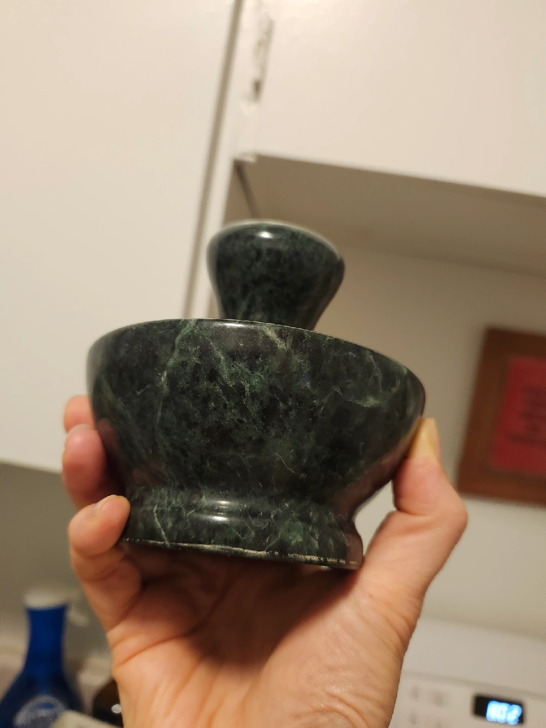 Selling a mortar and pestle set in a dark green colour. It's perfect for grinding herbs and spices in the kitchen made from stone 3 inches wide