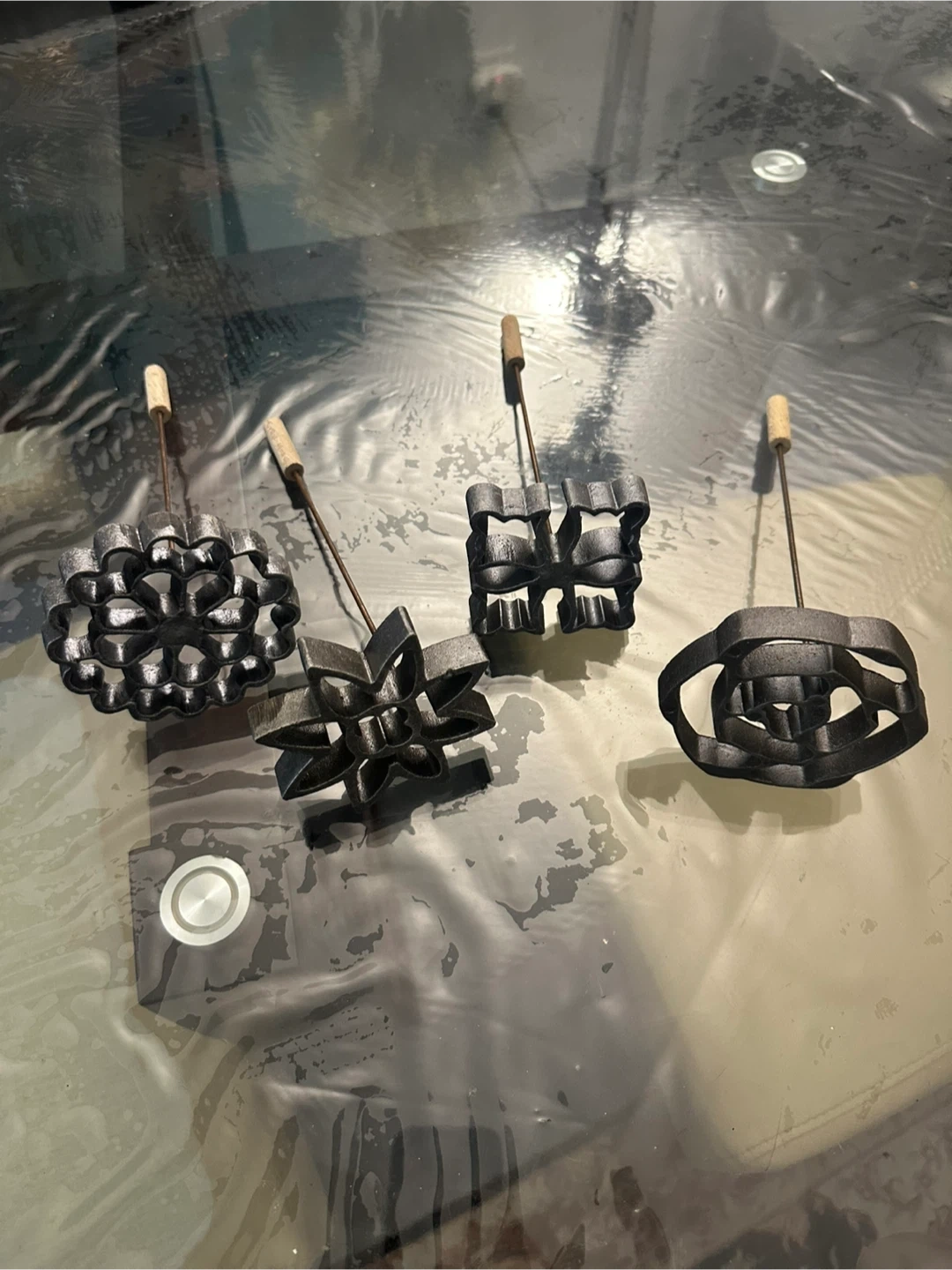Selling a set of four rosette irons! These are great for making traditional Scandinavian rosette cookies. Each iron has a different shape, so you can make a variety of beautiful cookies. They are in good condition and ready for your next baking adventure