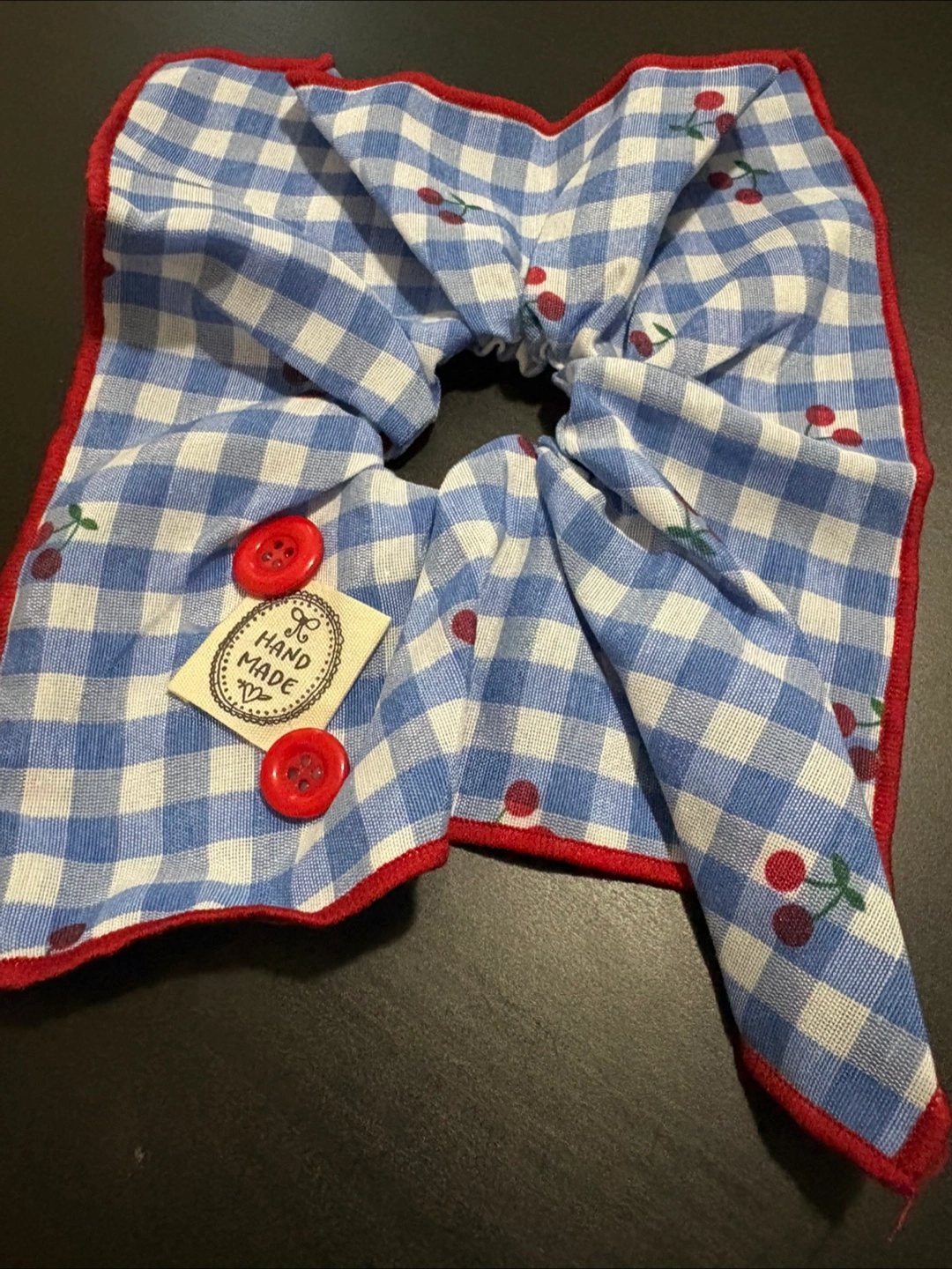 Super cute, handmade scrunchie! It's a blue and white gingham pattern with little cherries. It also has two red buttons for extra flair