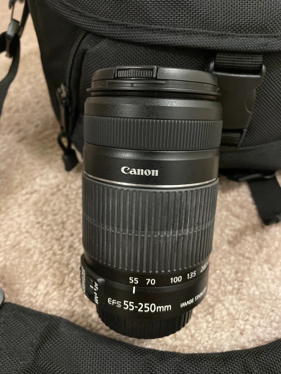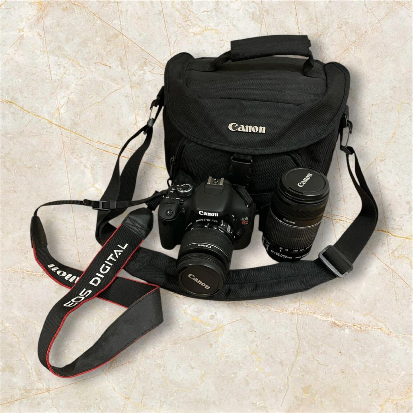 Selling a Canon EOS Rebel T3i camera kit! It comes with the camera body, an EFS 18-55mm lens, and an EFS 55-250mm lens. Also included is a Canon camera bag and EOS Digital strap to keep everything safe and secure