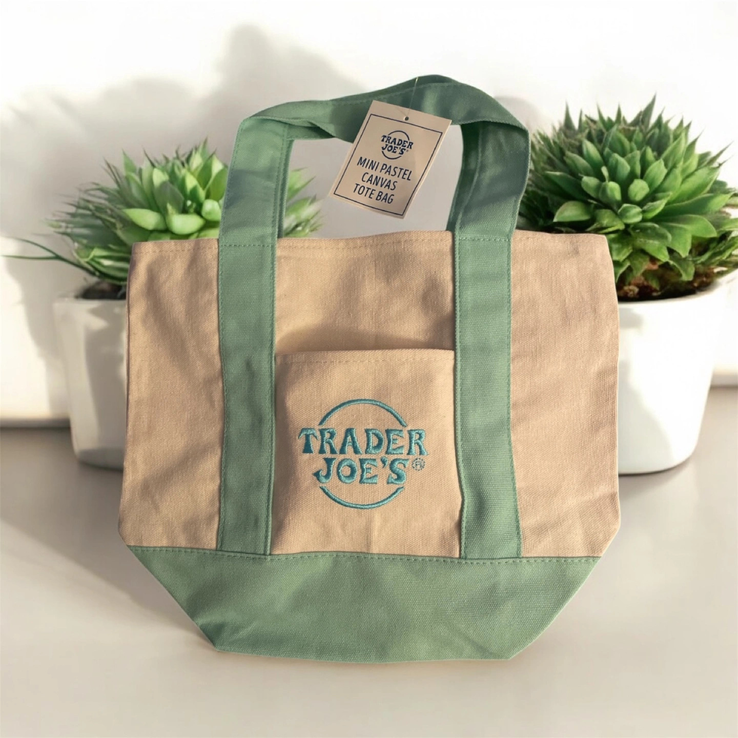 Super cute Trader Joe's mini pastel canvas tote bag! Perfect for small errands or as a reusable lunch bag. The colours are really nice and subtle. It's new!