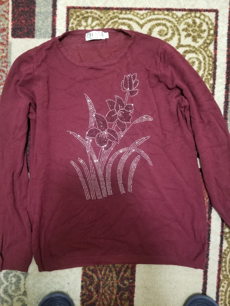 A comfy burgundy long-sleeve top from Chase! It features a pretty floral design made of small rhinestones on the front. Perfect for adding a bit of sparkle to your everyday look!