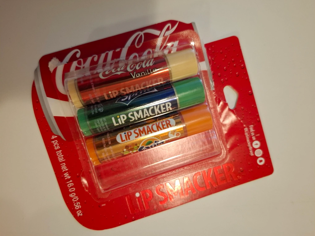 Selling a brand new, sealed 4-pack of Lip Smacker lip balms featuring Coca-Cola flavours! This set includes Vanilla Coke, Sprite, and Fanta
