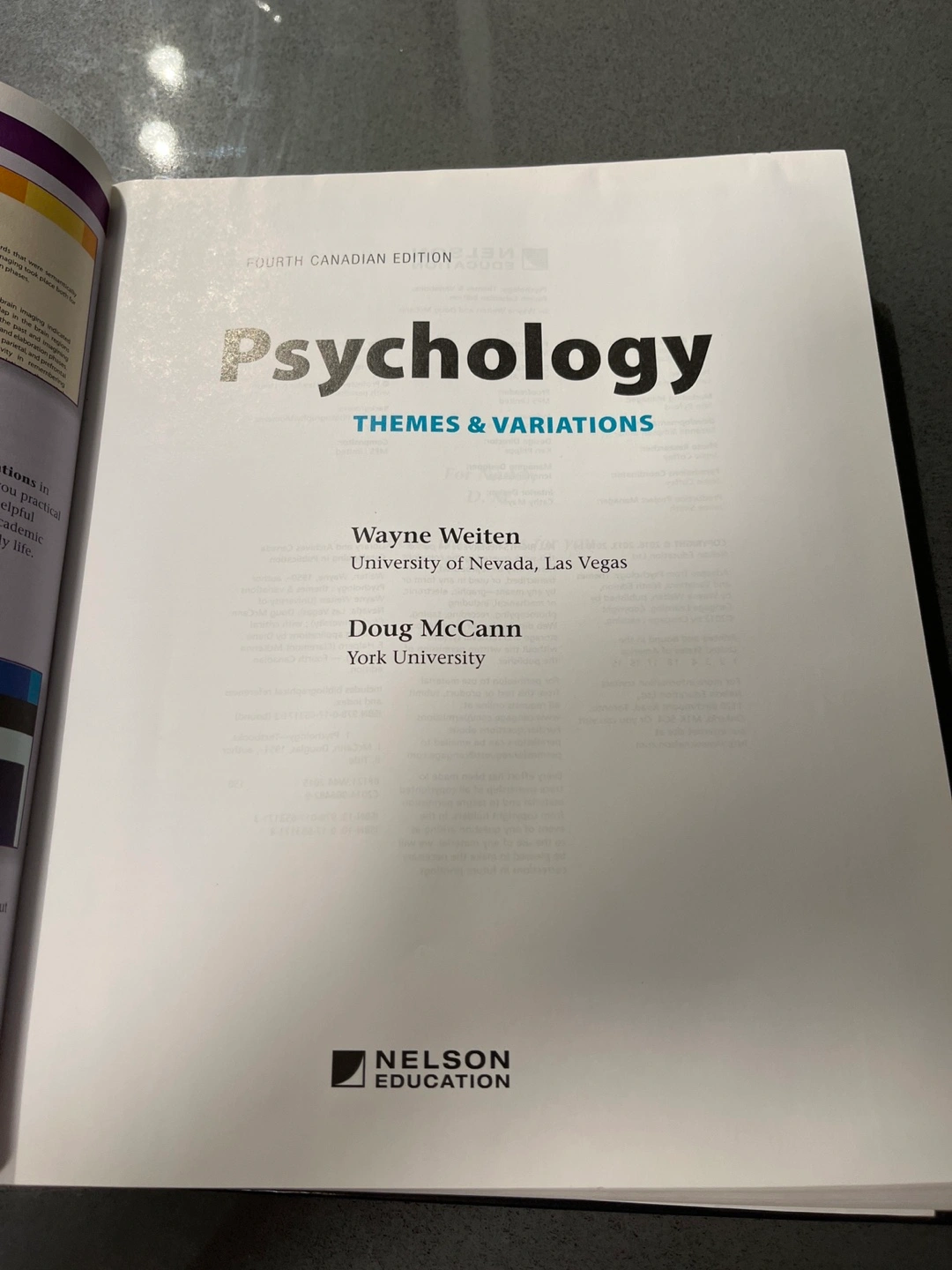 Selling a used copy of Psychology: Themes & Variations, Fourth Canadian Edition by Wayne Weiten and Doug McCann. It's in good condition and ready for a new home. Great for students!