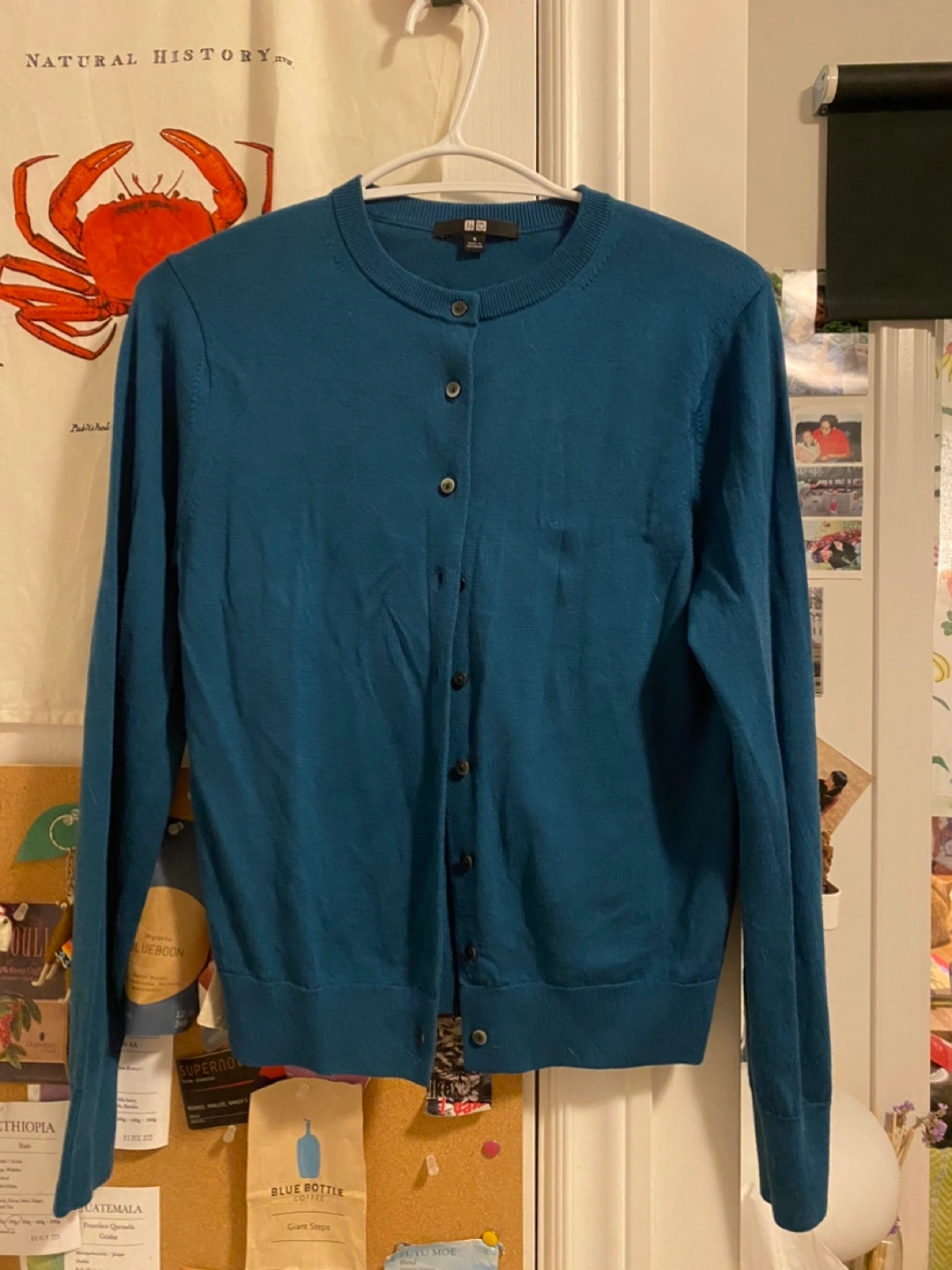 Selling a Uniqlo cardigan in a lovely teal color. It's a size small and in great condition. Bought in Japan, size closes to Xs/s. Wonky wore during the trip cuz of the weather. Perfect for layering or wearing on its own