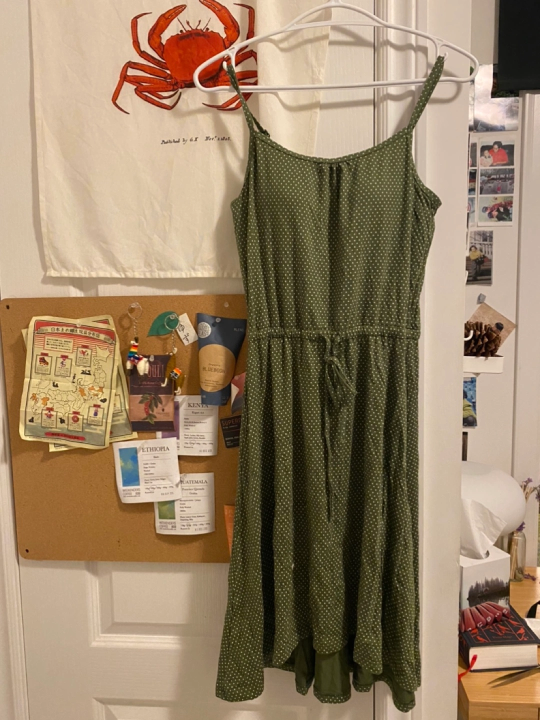 This is a cute green dress from Uniqlo in size M. The material is 68% rayon, 29% cotton, and 3% polyurethane. It features a subtle polka dot pattern and a comfortable, flowy fit. Perfect for casual outings or dressing up! Bought in Japan. Size close to a small I can meet at Adelaide east & sherbourne or king station most of the days!
