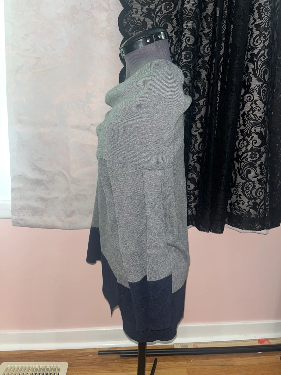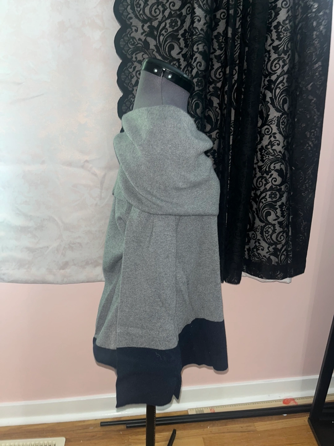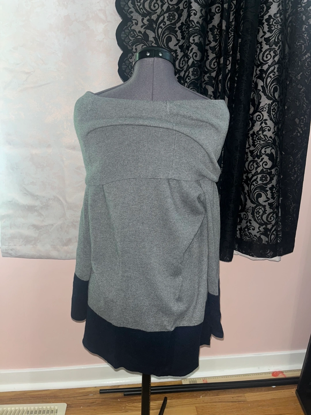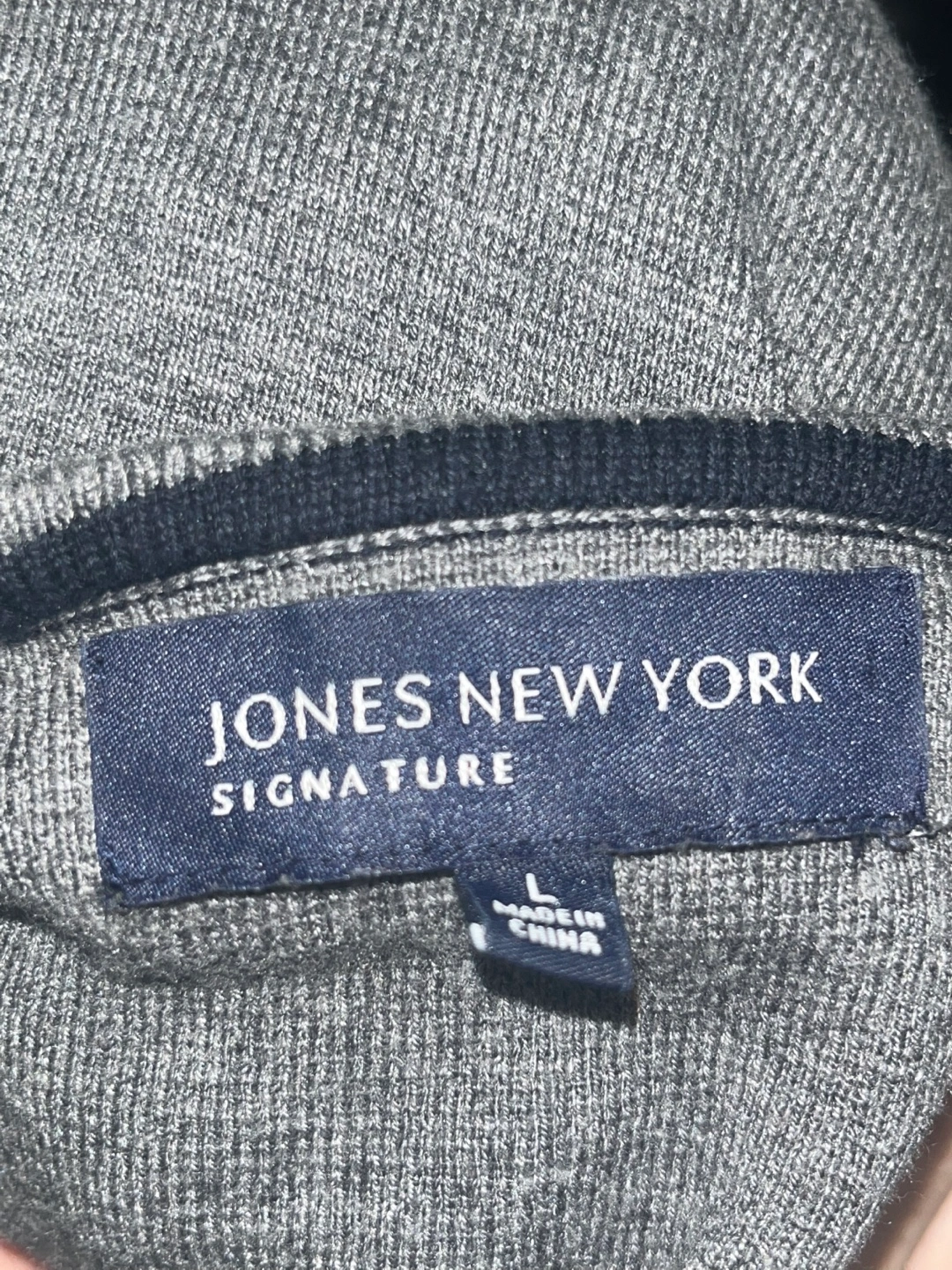 Selling a Jones New York Signature sweater in size L. It's a lovely grey colour with a dark black accent at the bottom. This sweater is in great condition and ready for a new home