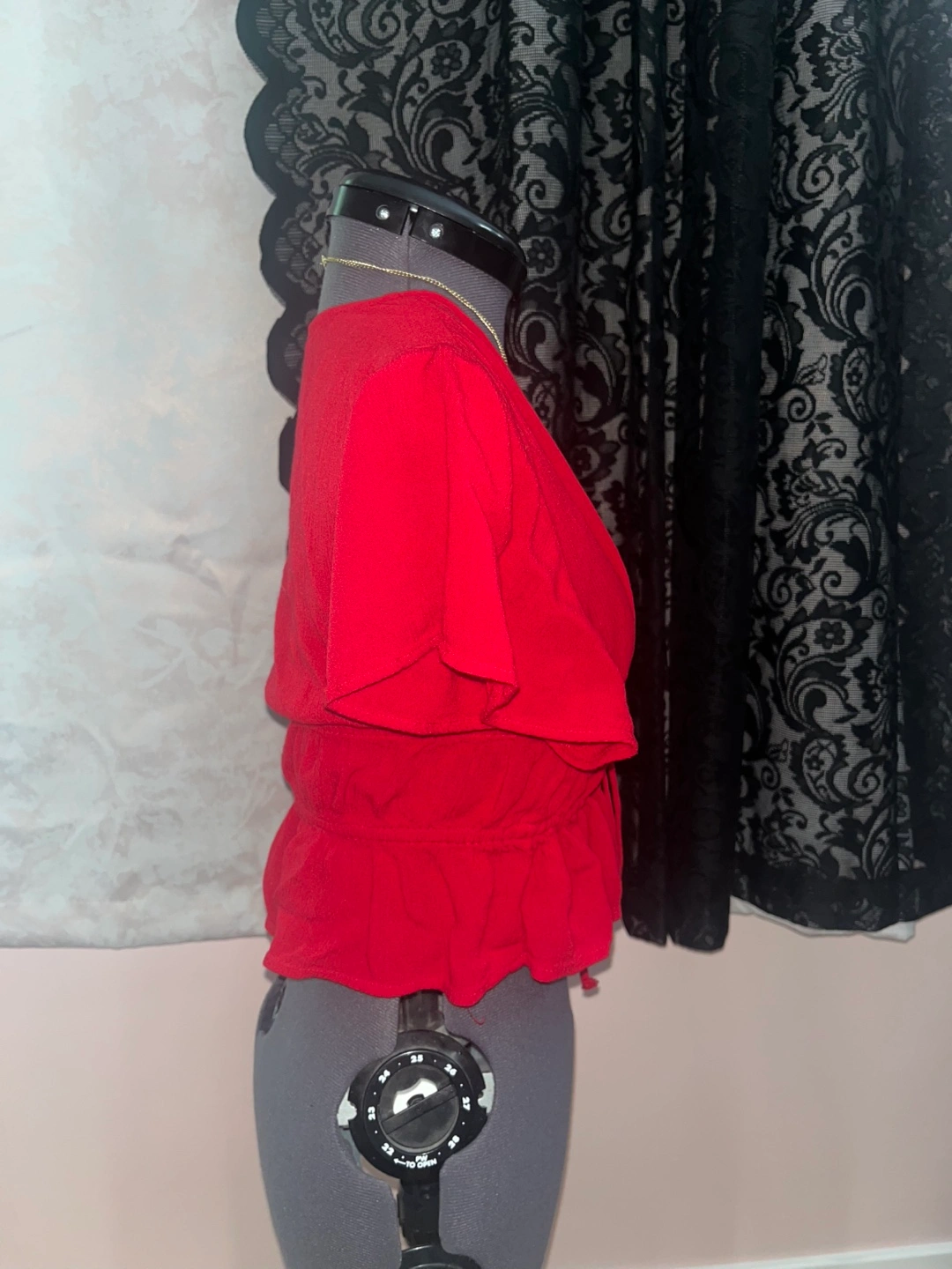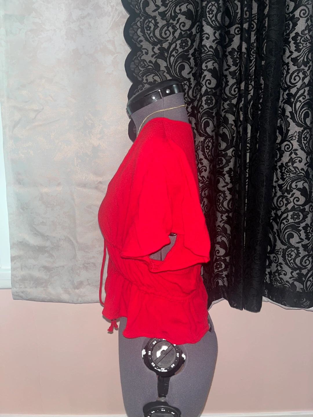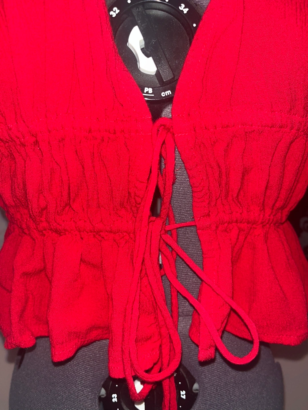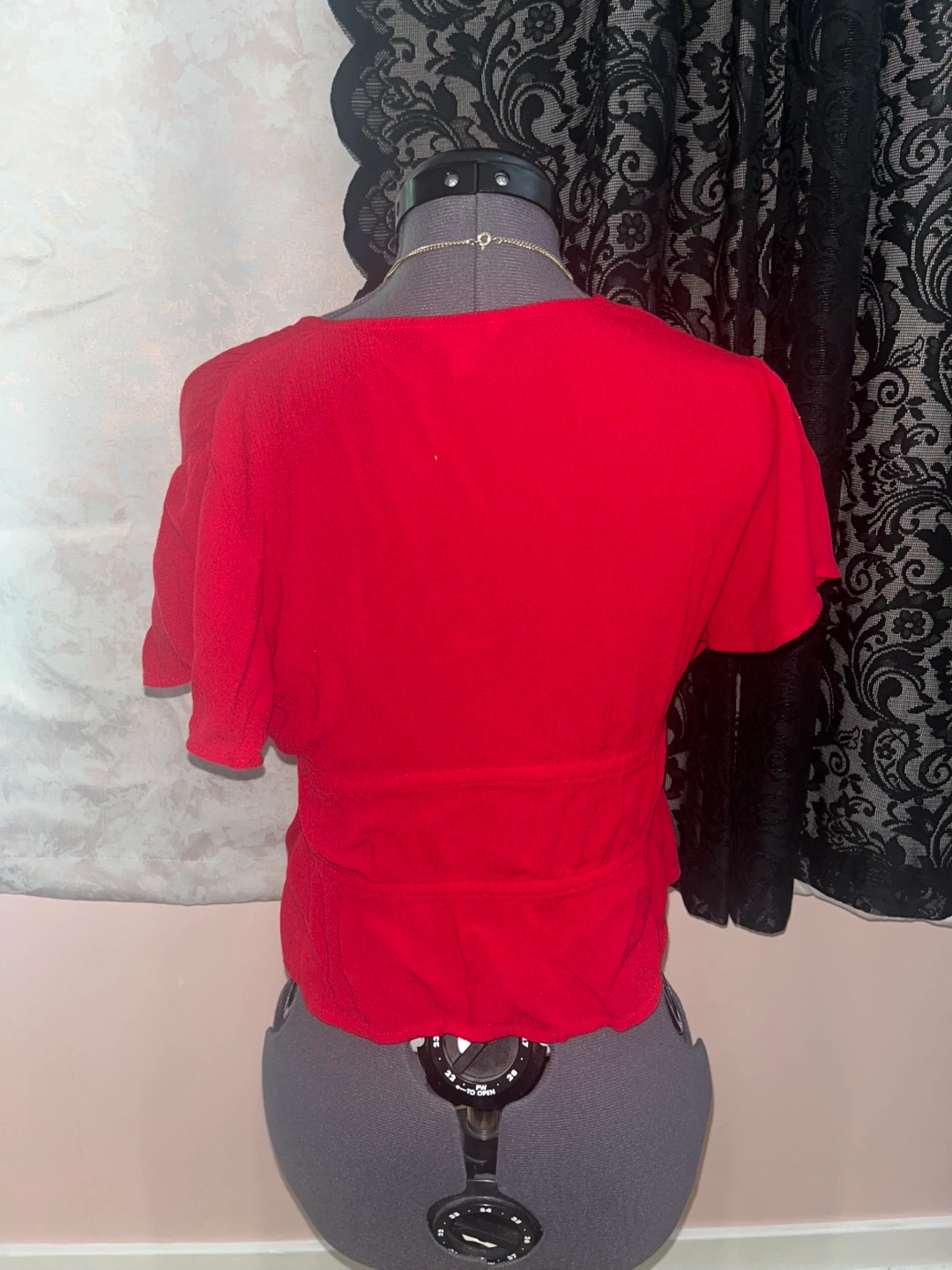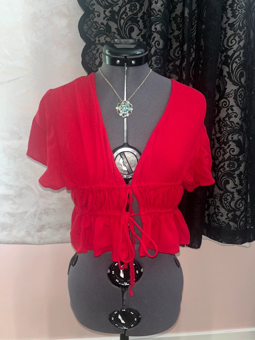 Selling a cute red tie-front blouse! It features short sleeves and a ruffled hem. Perfect for a casual day out or dressing up for an evening. It's in great condition and ready for a new home!