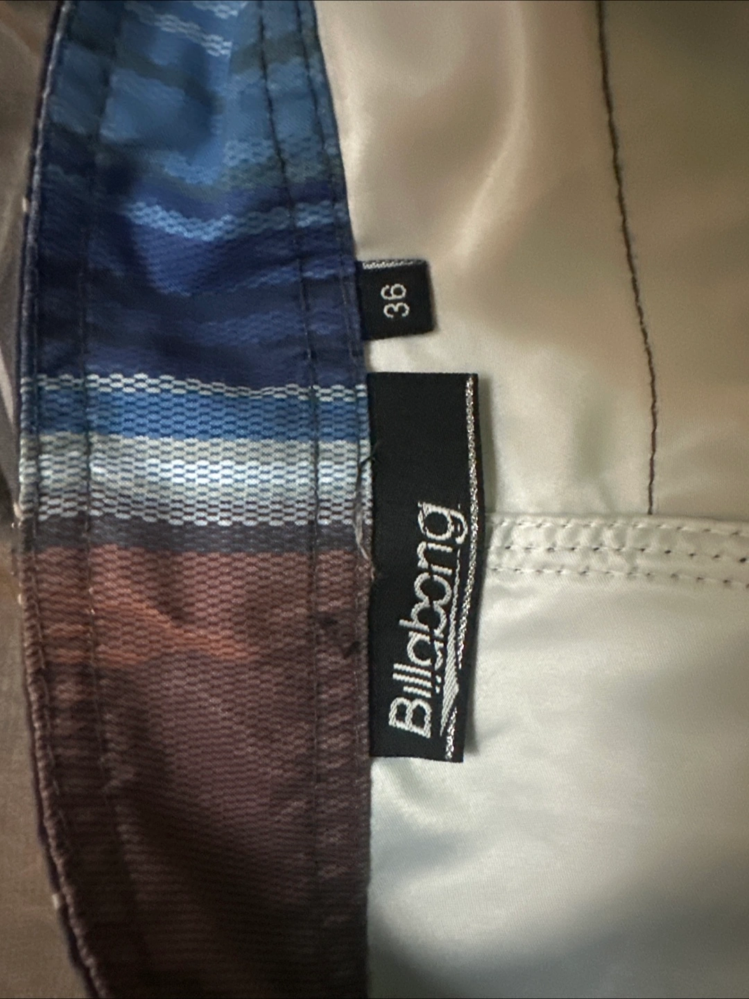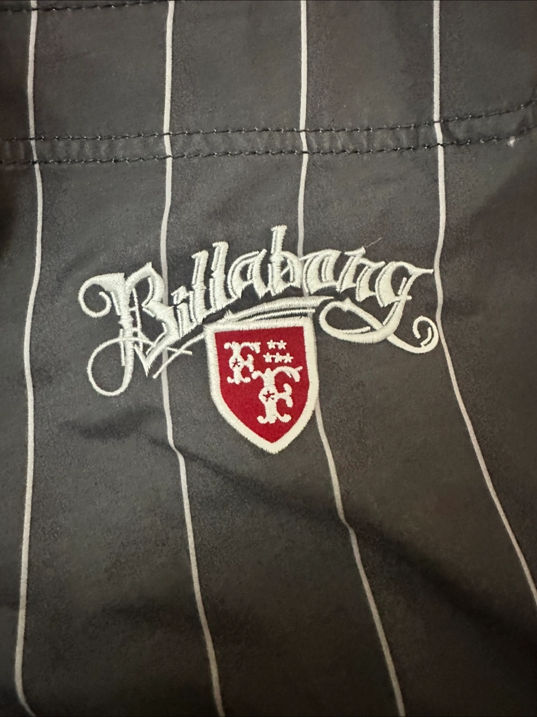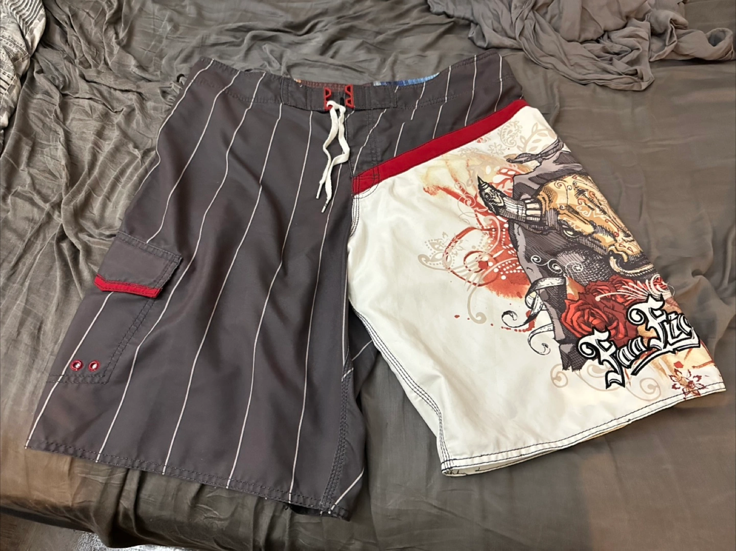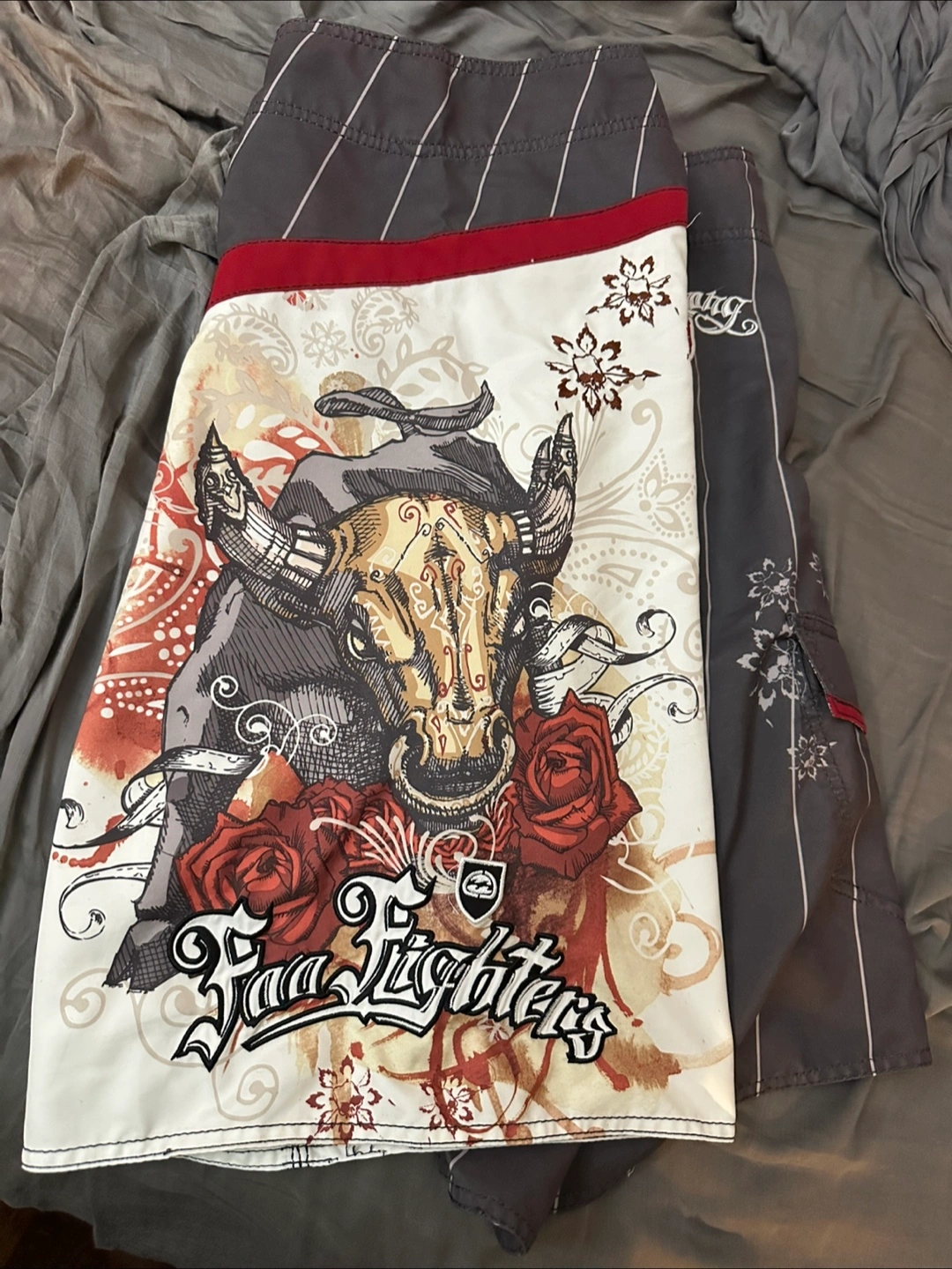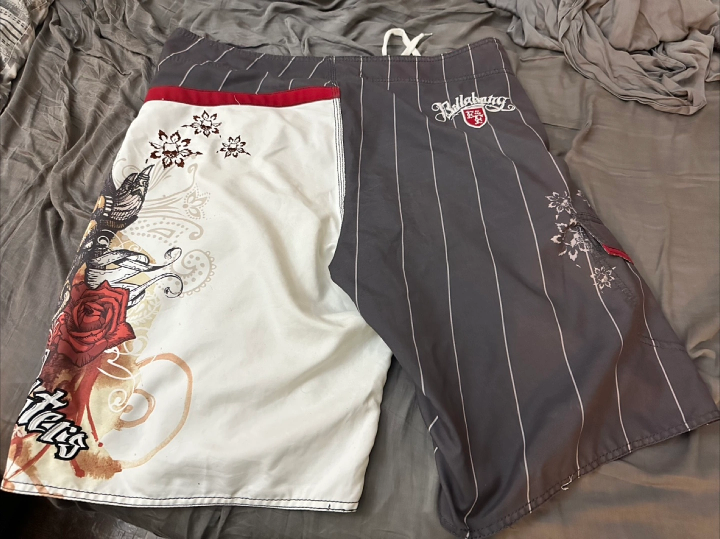 Billabong board shorts in great condition! They feature a unique design with a bull and roses on one side and grey stripes on the other. Size 36