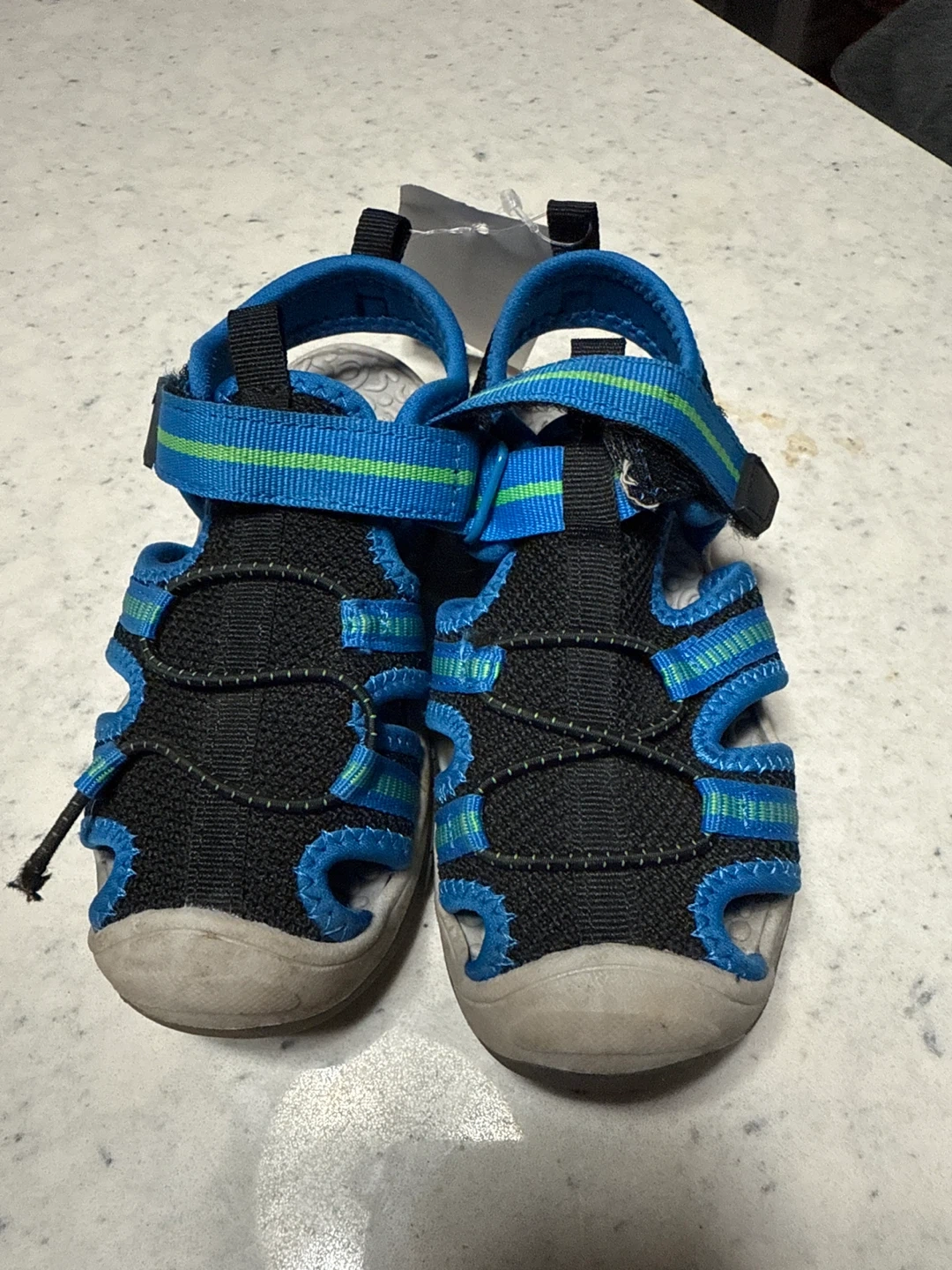 These sandals are perfect for your little one! They feature a black and blue design with green accents. They are in good used condition.