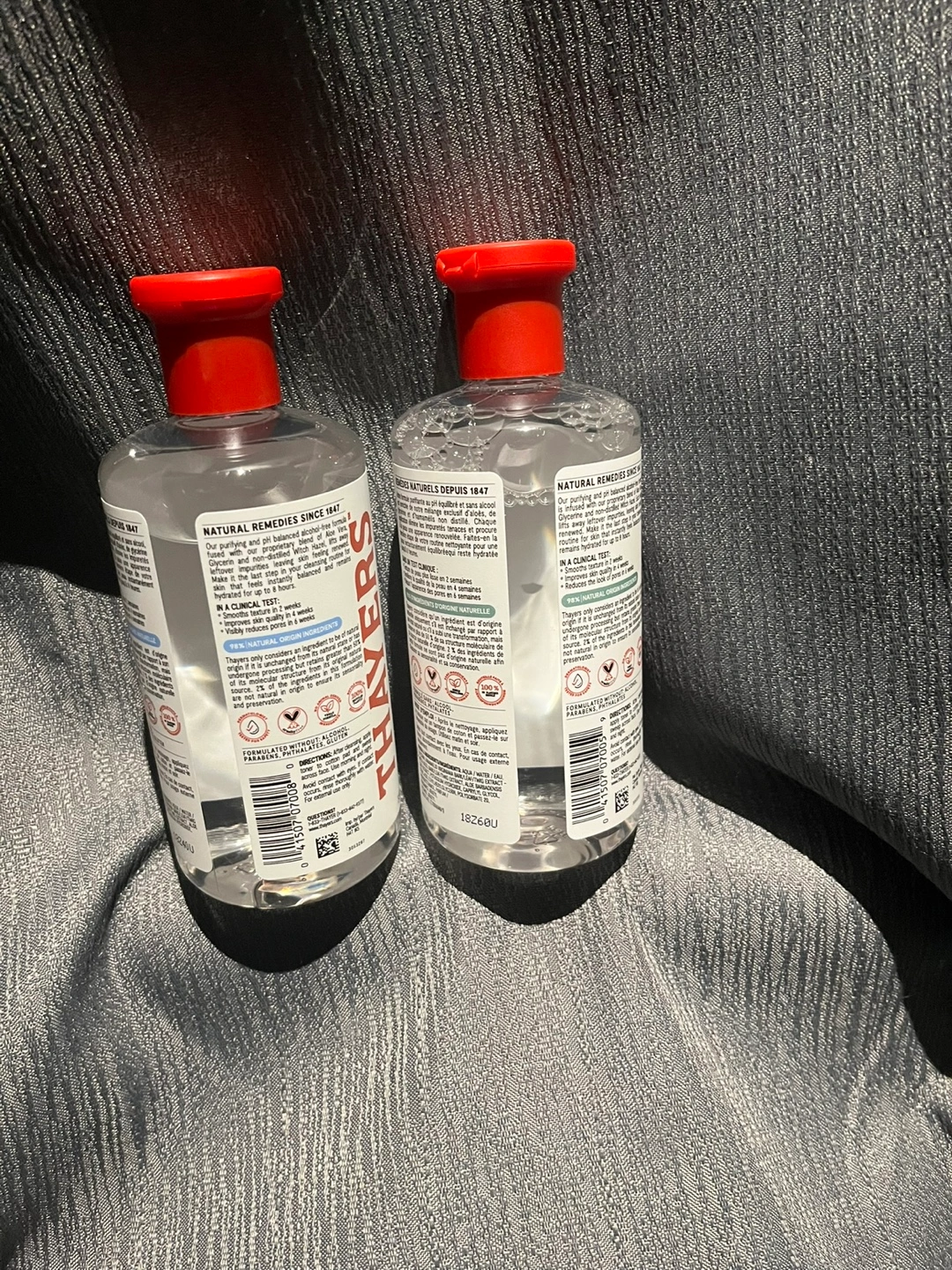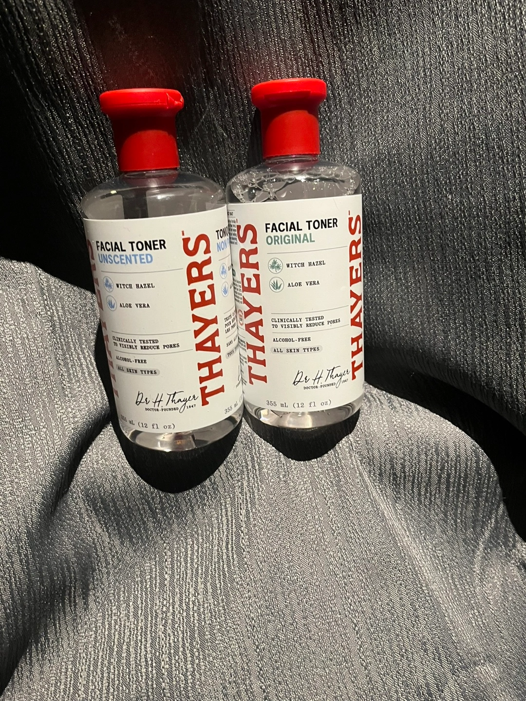 Selling two bottles of Thayers Facial Toner. One is the original formula and the other is unscented. Both are 355 mL (12 fl oz) and contain witch hazel and aloe vera. They're alcohol-free and suitable for all skin types