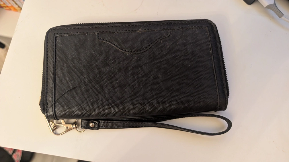 Selling a black wristlet wallet. It has a zippered closure and a wrist strap. There is a small scratch on the front.