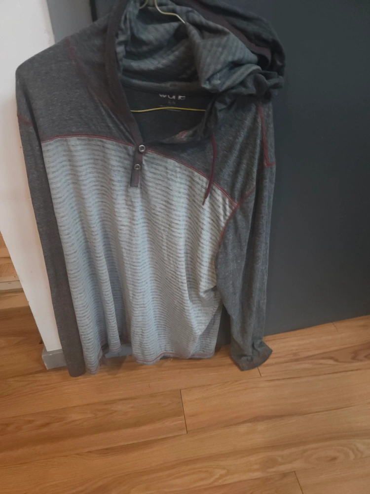 25Selling a comfortable grey WUC hoodie with a striped pattern. It features a hood and a buttoned neckline. Perfect for casual wear!