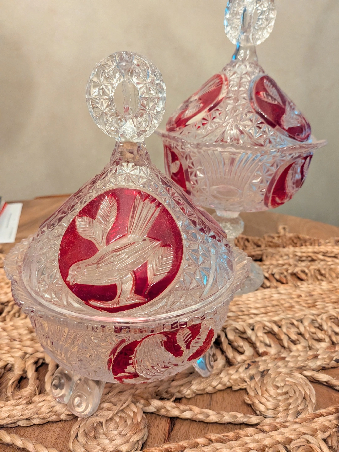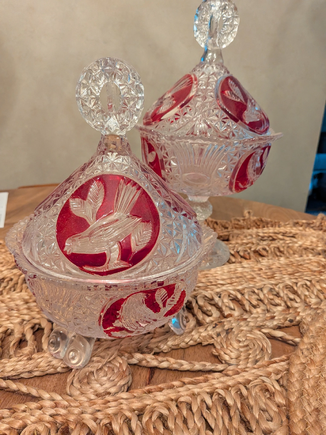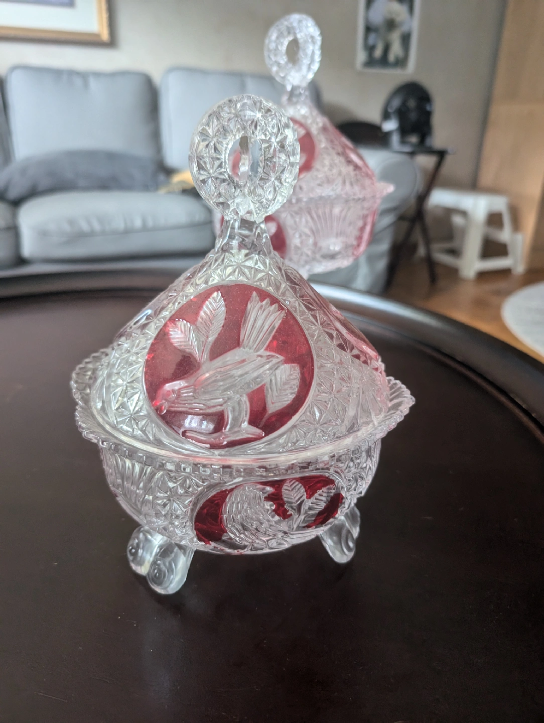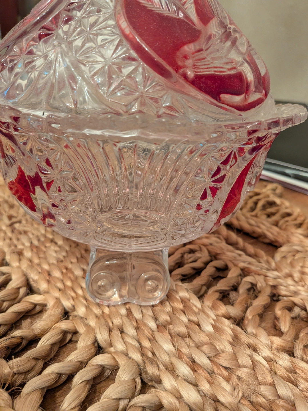Beautiful glass candy dish with a lid, perfect for adding a touch of elegance to your home. The intricate bird design and red accents make it a standout piece. It's in great condition and ready to be enjoyed! Good condition, no issues Cash only, no etransfers Etobicoke meetup. Rathburn and Renforth First come, first serve, no holds