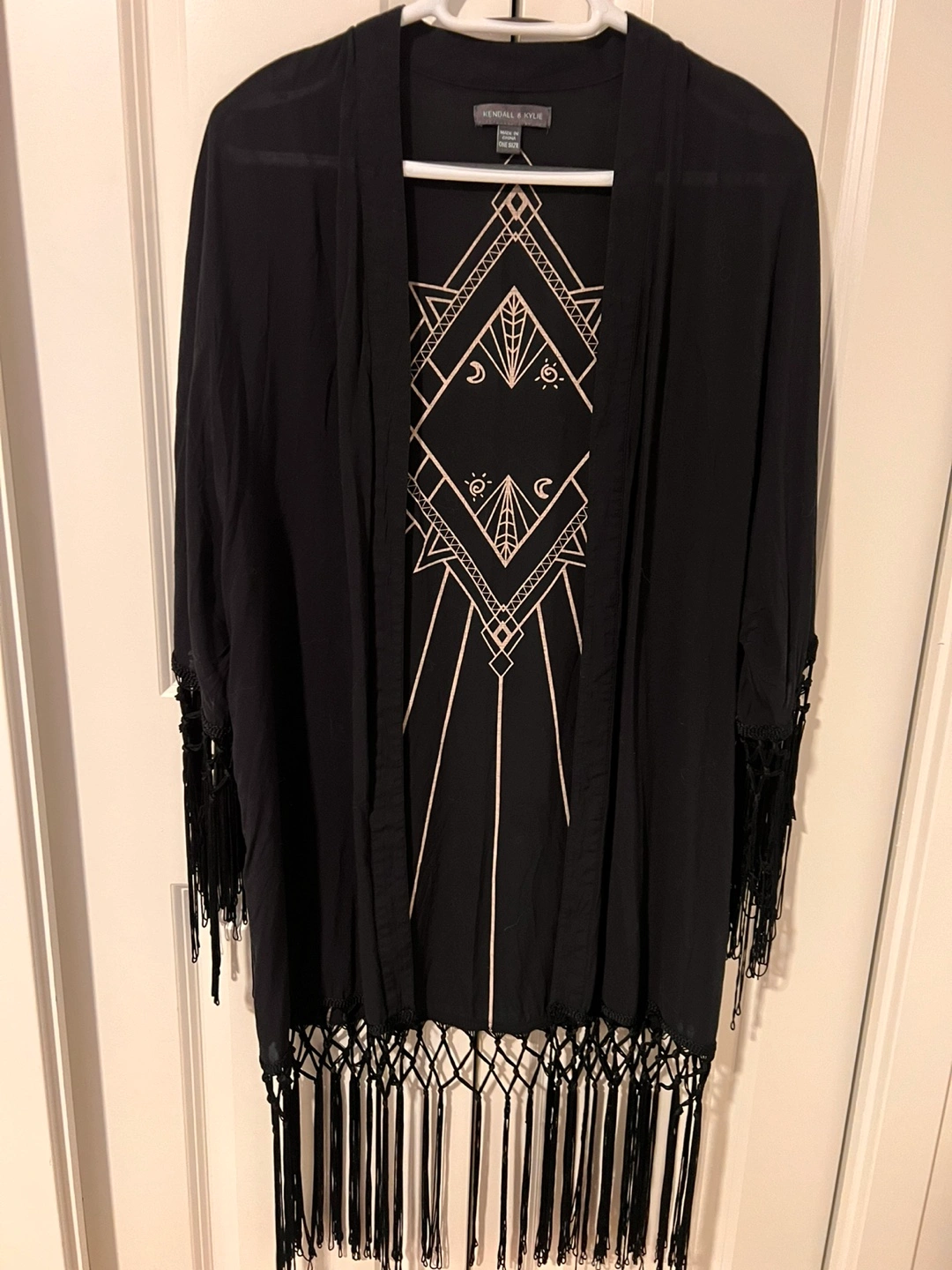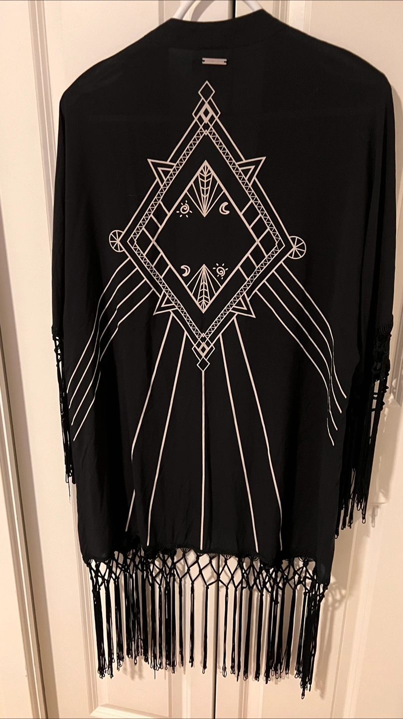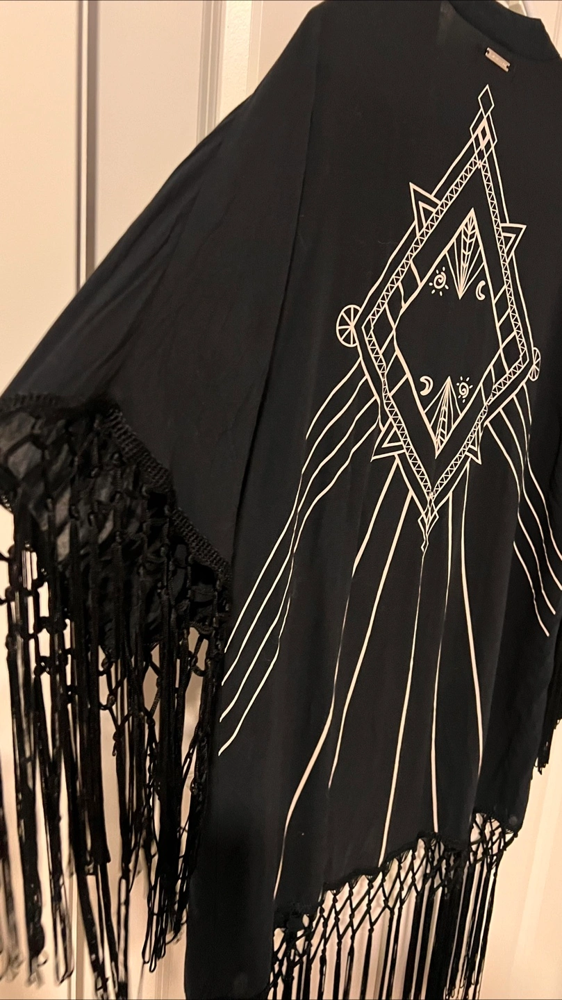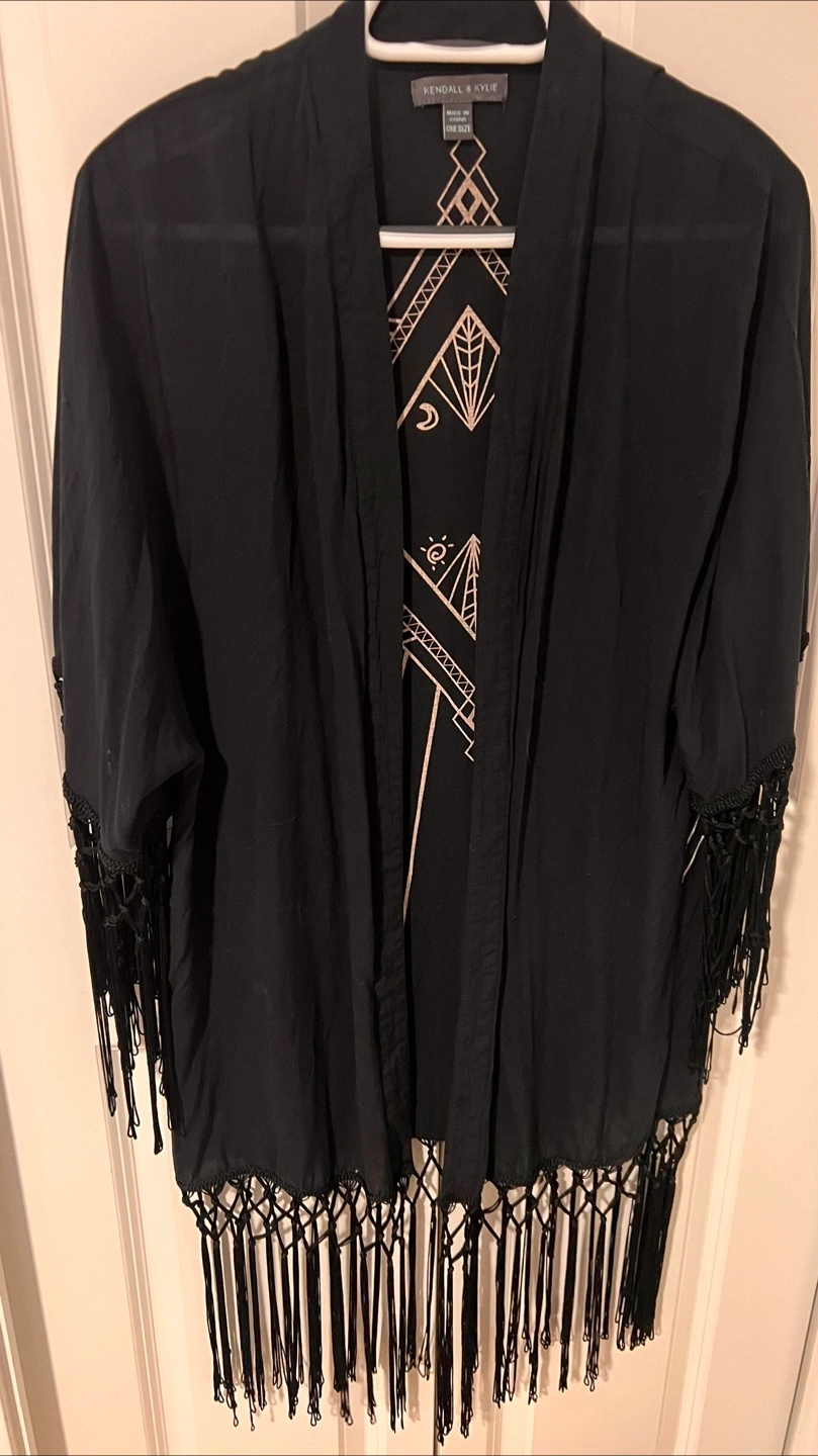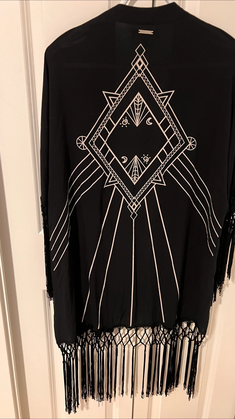 Silky material and very flow-y More like a kimono style One size Near 128 and 64 avenue Cash only