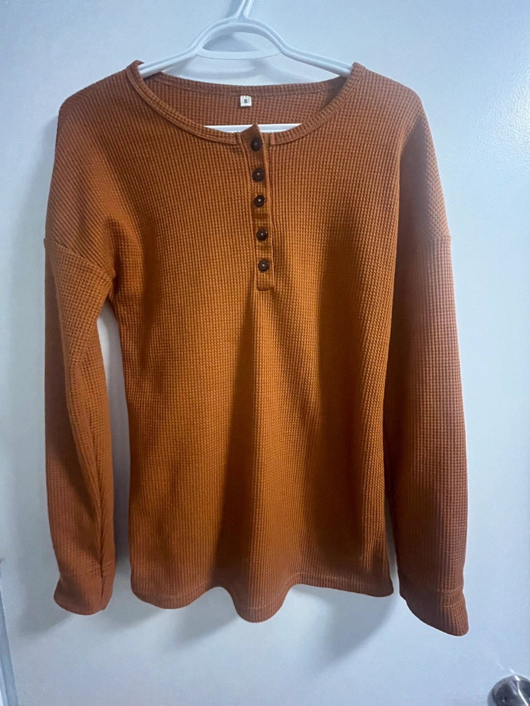 This medium-sized, burnt orange, long-sleeved waffle shirt is perfect for layering or wearing on its own! It is in good condition and features a Henley button-up neckline. Key details include: - Size: Medium - Colour: Burnt Orange - Sleeve Length: Long Sleeve - Style: Waffle Knit Henley Based on similar listings online , I'm pricing this lovely top at $15. If the ad is up, it's available! Don't miss out on this fantastic find. Pickup downtown and cash only!