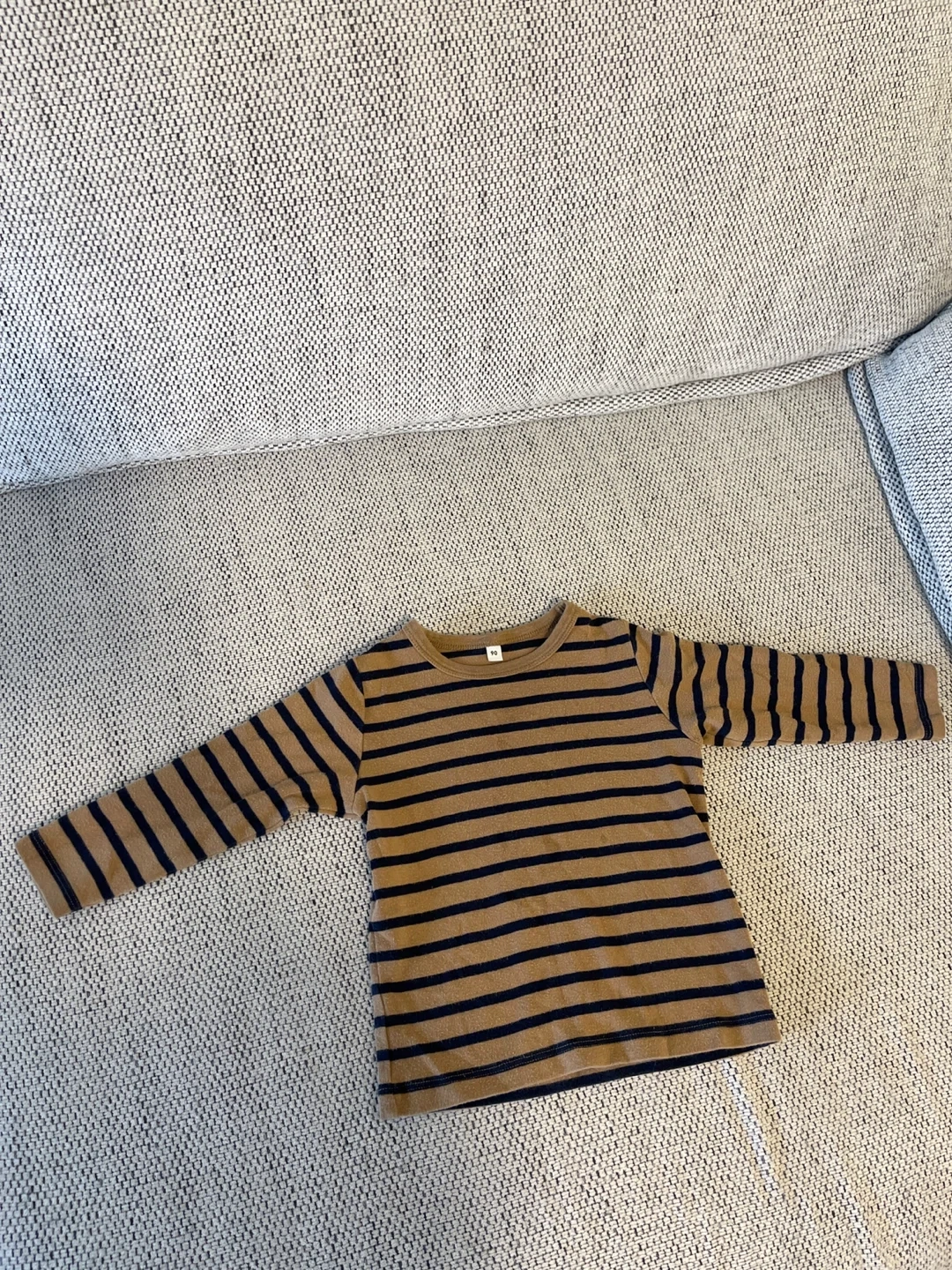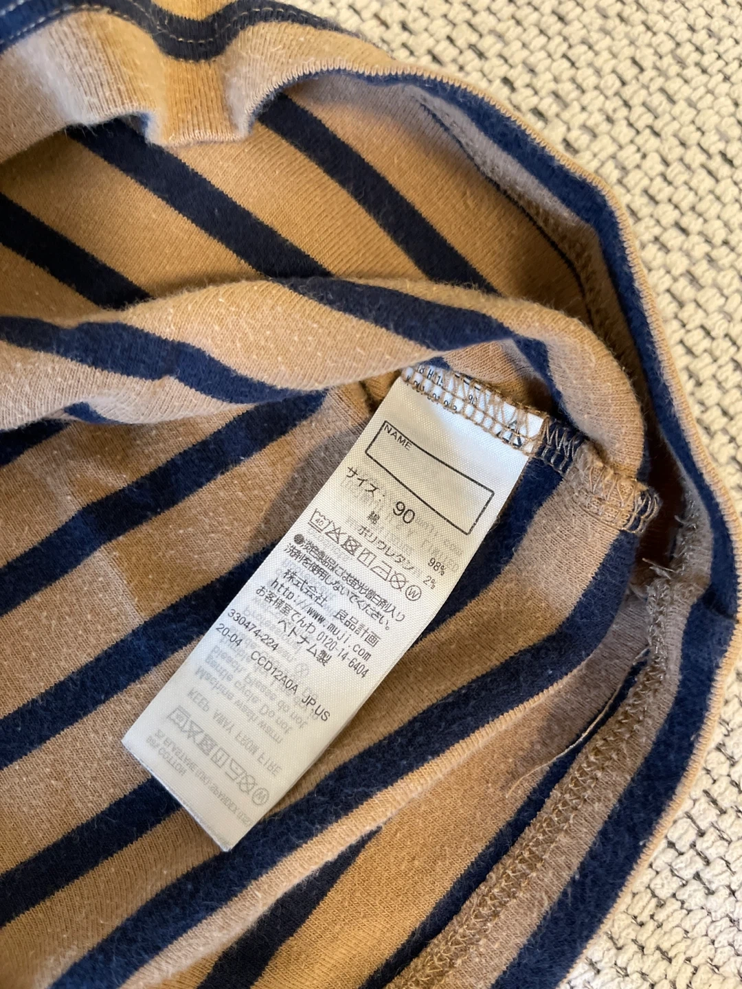 A cute striped long sleeve top in size 90! It features a classic striped pattern, perfect for layering or wearing on its own. Great for keeping your little one comfy and stylish 98% cotton 2% polyester From Muji Kids Wear